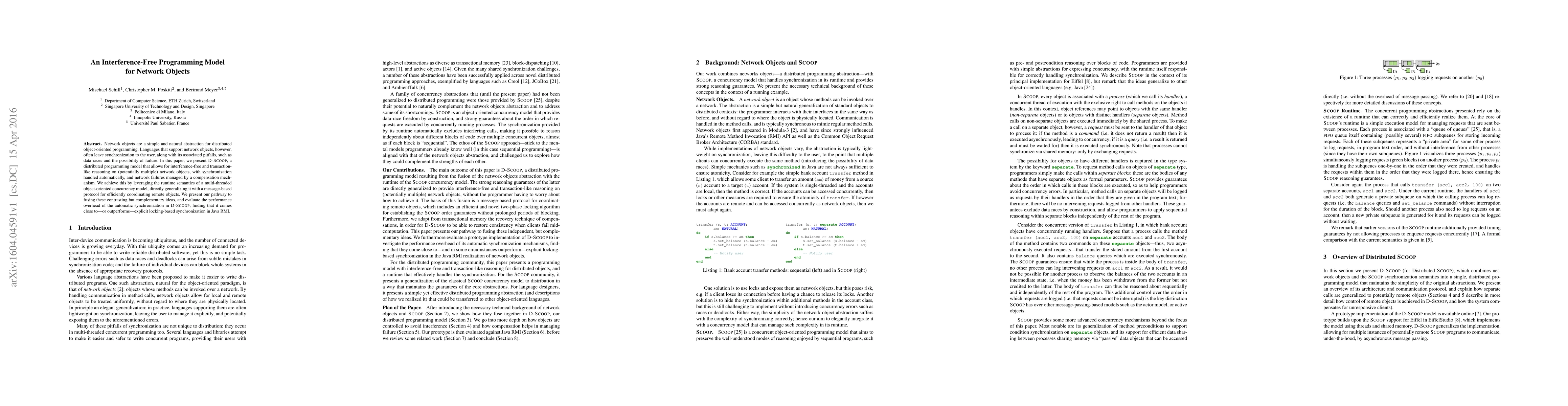Network objects are a simple and natural abstraction for distributed object-oriented programming. Languages that support network objects, however, often leave synchronization to the user, along with its associated pitfalls, such as data races and the possibility of failure. In this paper, we present D-SCOOP, a distributed programming model that allows for interference-free and transaction-like reasoning on (potentially multiple) network objects, with synchronization handled automatically, and network failures managed by a compensation mechanism. We achieve this by leveraging the runtime semantics of a multi-threaded object-oriented concurrency model, directly generalizing it with a message-based protocol for efficiently coordinating remote objects. We present our pathway to fusing these contrasting but complementary ideas, and evaluate the performance overhead of the automatic synchronization in D-SCOOP, finding that it comes close to---or outperforms---explicit locking-based synchronization in Java RMI.