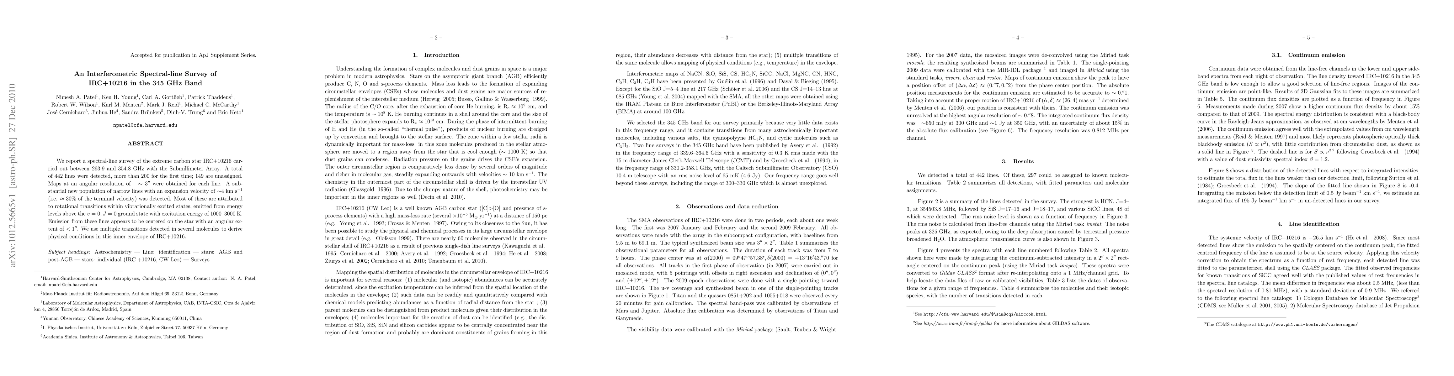 Researchers detected over 200 new spectral lines in the extreme carbon star IRC+10216 using the Submillimeter Array, revealing a population of narrow lines with high expansion velocities, which they attribute to rotational transitions within vibrationally excited states.
