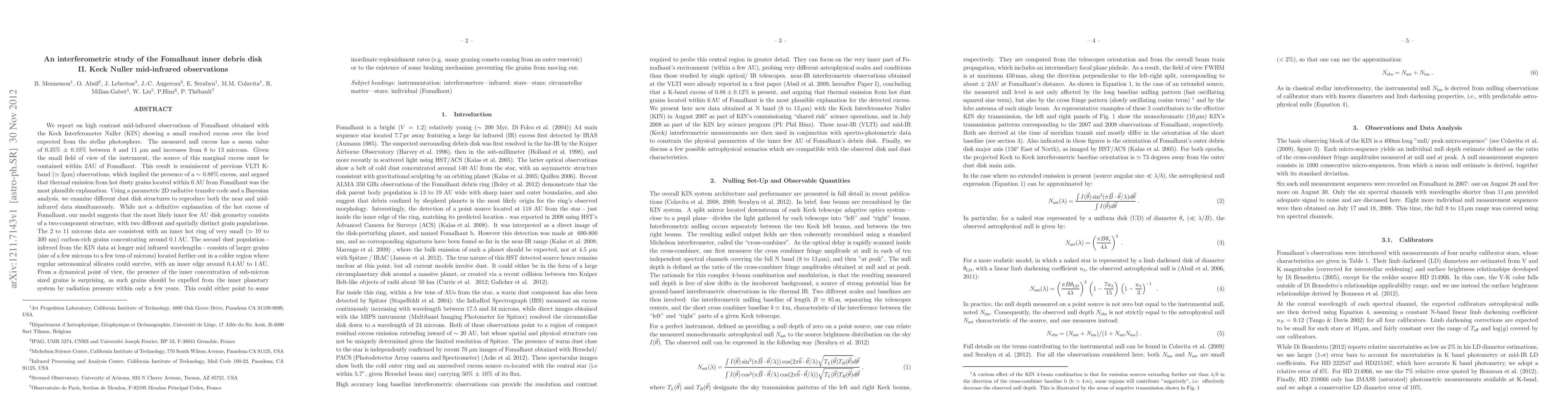 We report on high contrast mid-infrared observations of Fomalhaut obtained with the Keck Interferometer Nuller (KIN) showing a small resolved excess over the level expected from the stellar photosphere. The measured null excess has a mean value of 0.35% +/- 0.10% between 8 and 11 microns and increases from 8 to 13 microns. Given the small field of view of the instrument, the source of this marginal excess must be contained within 2AU of Fomalhaut. This result is reminiscent of previous VLTI K-band observations, which implied the presence of a ~ 0.88% excess, and argued that thermal emission from hot dusty grains located within 6 AU from Fomalhaut was the most plausible explanation. Using a parametric 2D radiative transfer code and a Bayesian analysis, we examine different dust disk structures to reproduce both the near and mid-infrared data simultaneously. While not a definitive explanation of the hot excess of Fomalhaut, our model suggests that the most likely inner few AU disk geometry consists of a two-component structure, with two different and spatially distinct grain populations. The 2 to 11 microns data are consistent with an inner hot ring of very small (~ 10 to 300 nm) carbon-rich grains concentrating around 0.1AU. The second dust population consists of larger grains (size of a few microns to a few tens of microns) located further out in a colder region where regular astronomical silicates could survive, with an inner edge around 1AU. From a dynamical point of view, the presence of the inner concentration of sub-micron sized grains is surprising, as such grains should be expelled from the inner planetary system by radiation pressure within only a few years. This could either point to some inordinate replenishment rates (e.g. many grazing comets coming from an outer reservoir) or to the existence of some braking mechanism preventing the grains from moving out.