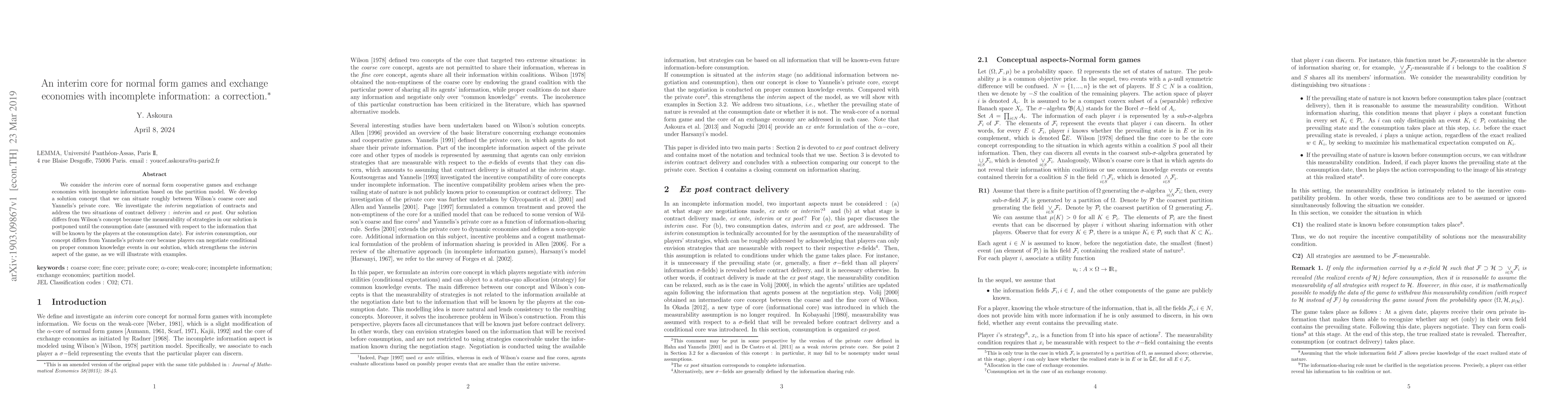 This paper proposes a new interim core solution concept for cooperative games and exchange economies with incomplete information, situating it between Wilson's coarse core and Yannelis's private core. The authors highlight that their approach allows for negotiation based on conditional common knowledge events, enhancing the interim negotiation process.