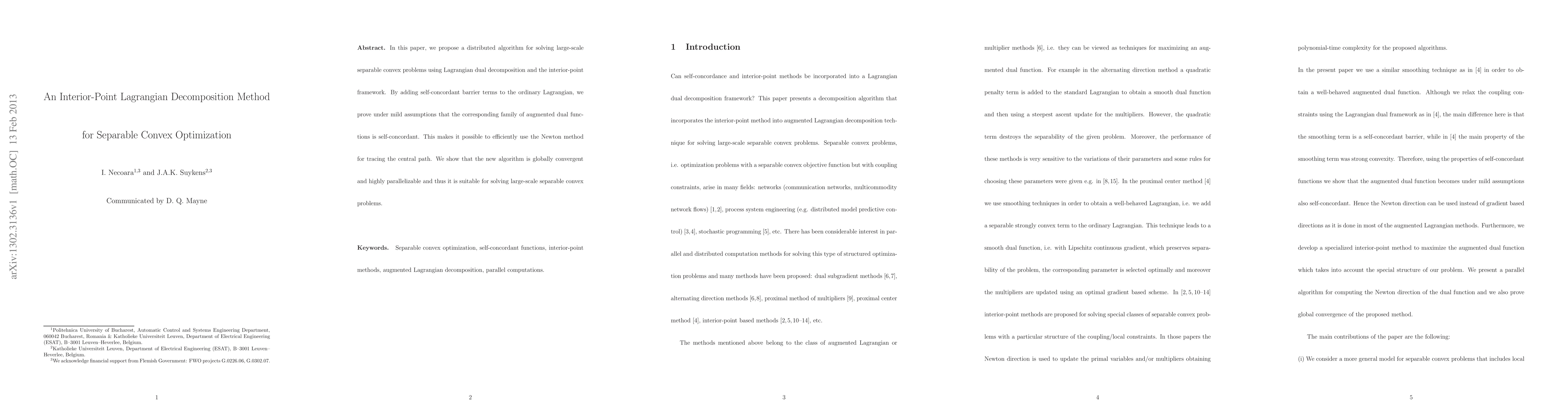 This paper proposes a distributed interior-point Lagrangian decomposition method for solving large-scale separable convex optimization problems. The method leverages self-concordant barrier terms and the Newton method for efficient convergence, demonstrating global convergence and high parallelizability.