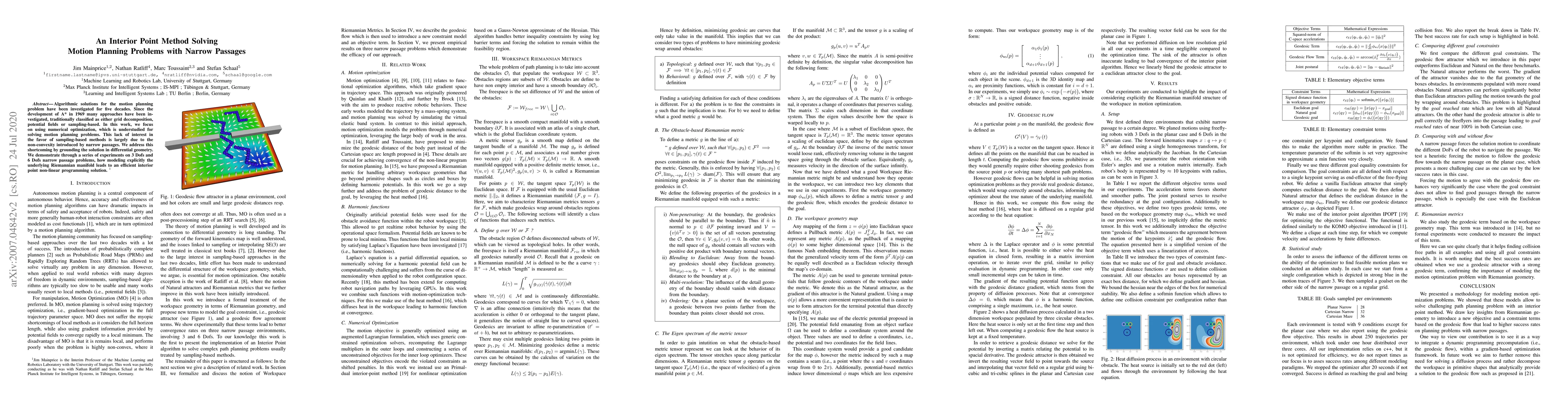 This paper proposes an interior point method for solving motion planning problems, particularly in narrow passages, by leveraging differential geometry and Riemannian manifolds to handle the non-convexity. Experimental results show the effectiveness of this approach for both 3 DoF and 6 DoF systems.