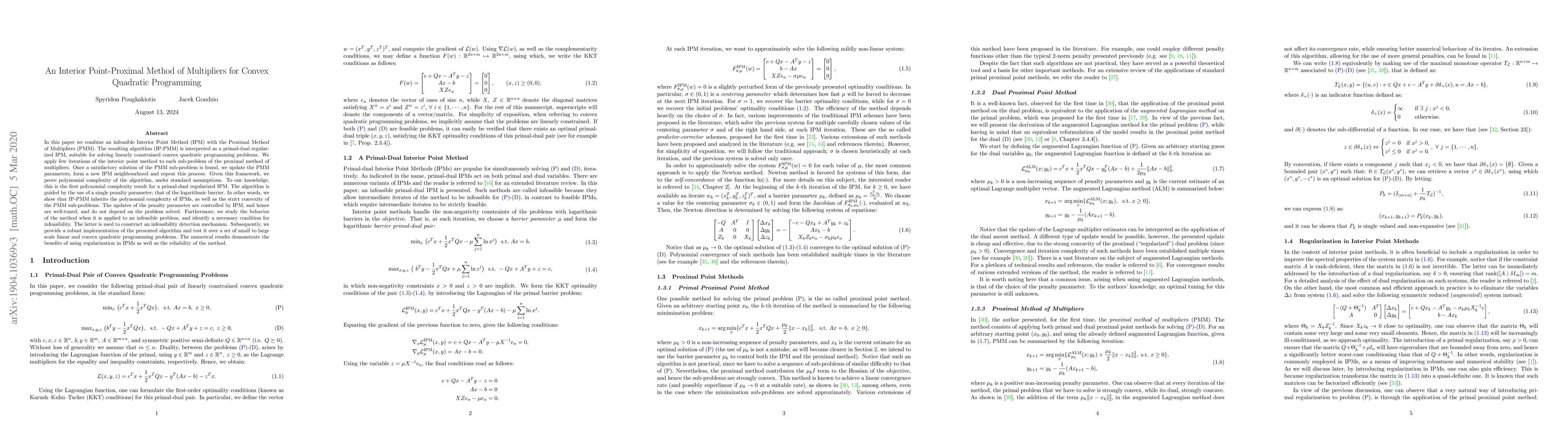 This paper proposes an Interior Point-Proximal Method of Multipliers (IP-PMM) for solving convex quadratic programming problems, combining an infeasible Interior Point Method with the Proximal Method of Multipliers. The algorithm demonstrates polynomial complexity, inherits the benefits of both methods, and includes an infeasibility detection mechanism. Numerical tests show the method's efficiency and reliability across various problem scales.