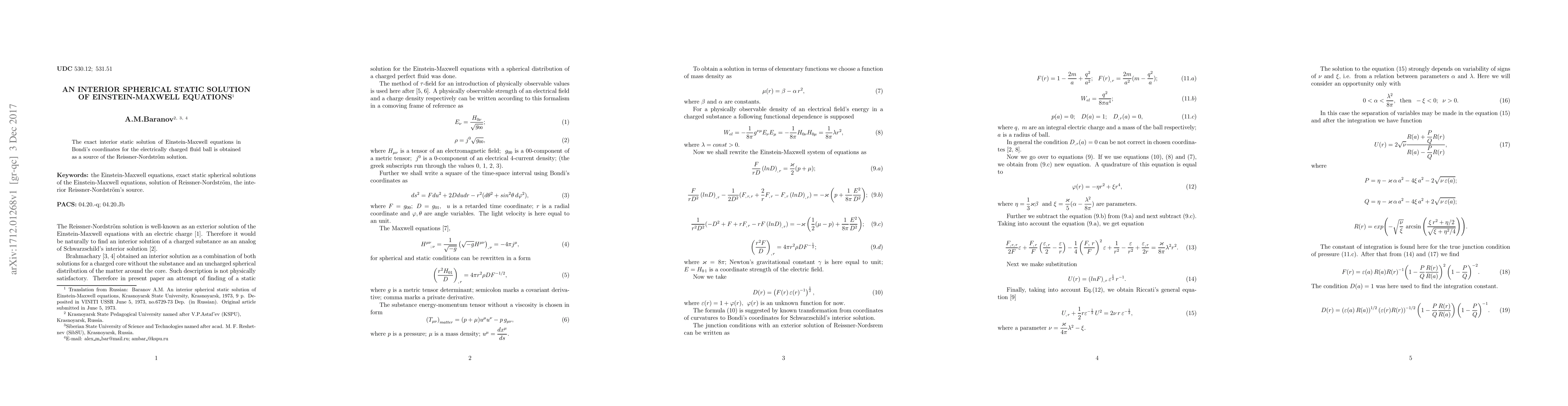 Researchers found an exact solution to a complex equation describing a charged fluid ball in space, using a specific coordinate system called Bondi's coordinates.