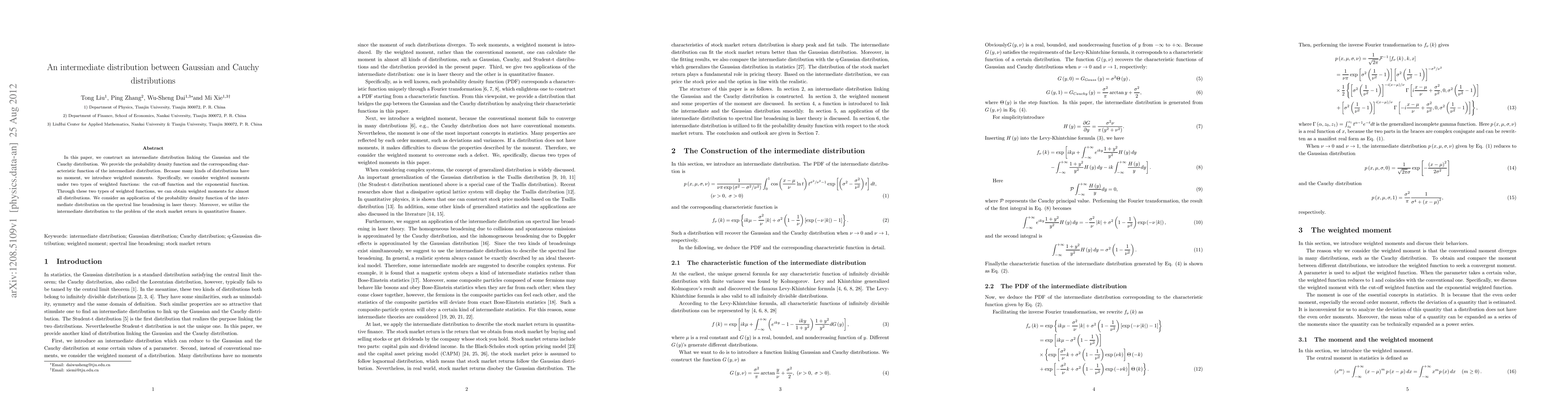 In this paper, we construct an intermediate distribution linking the Gaussian and the Cauchy distribution. We provide the probability density function and the corresponding characteristic function of the intermediate distribution. Because many kinds of distributions have no moment, we introduce weighted moments. Specifically, we consider weighted moments under two types of weighted functions: the cut-off function and the exponential function. Through these two types of weighted functions, we can obtain weighted moments for almost all distributions. We consider an application of the probability density function of the intermediate distribution on the spectral line broadening in laser theory. Moreover, we utilize the intermediate distribution to the problem of the stock market return in quantitative finance.