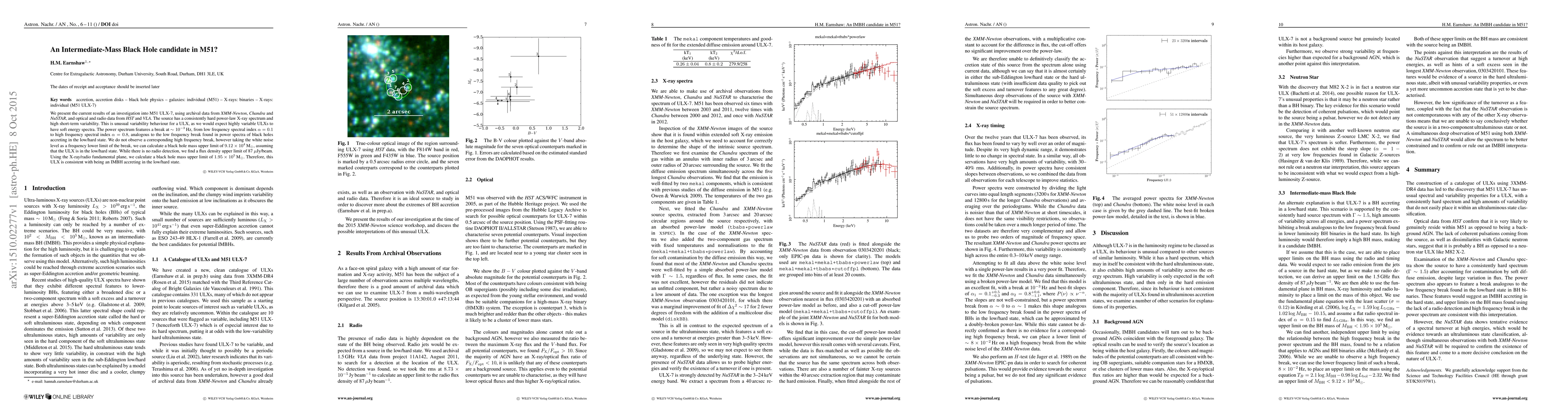 We present the current results of an investigation into M51 ULX-7, using archival data from XMM-Newton, Chandra and NuSTAR, and optical and radio data from HST and VLA. The source has a consistently hard power-law X-ray spectrum and high short-term variability. This is unusual variability behaviour for a ULX, as we would expect highly variable ULXs to have soft energy spectra. The power spectrum features a break at ~1e-3 Hz, from low frequency spectral index alpha=0.1 to high frequency spectral index alpha=0.8, analogous to the low frequency break found in power spectra of black holes accreting in the low/hard state. We do not observe a corresponding high frequency break, however taking the white noise level as a frequency lower limit of the break, we can calculate a black hole mass upper limit of 9.12e4 solar masses, assuming that the ULX is in the low/hard state. While there is no radio detection, we find a flux density upper limit of 87 micro-Jy/beam. Using the X-ray/radio fundamental plane, we calculate a black hole mass upper limit of 1.95e5 solar masses. Therefore, this ULX is consistent with being an IMBH accreting in the low/hard state.