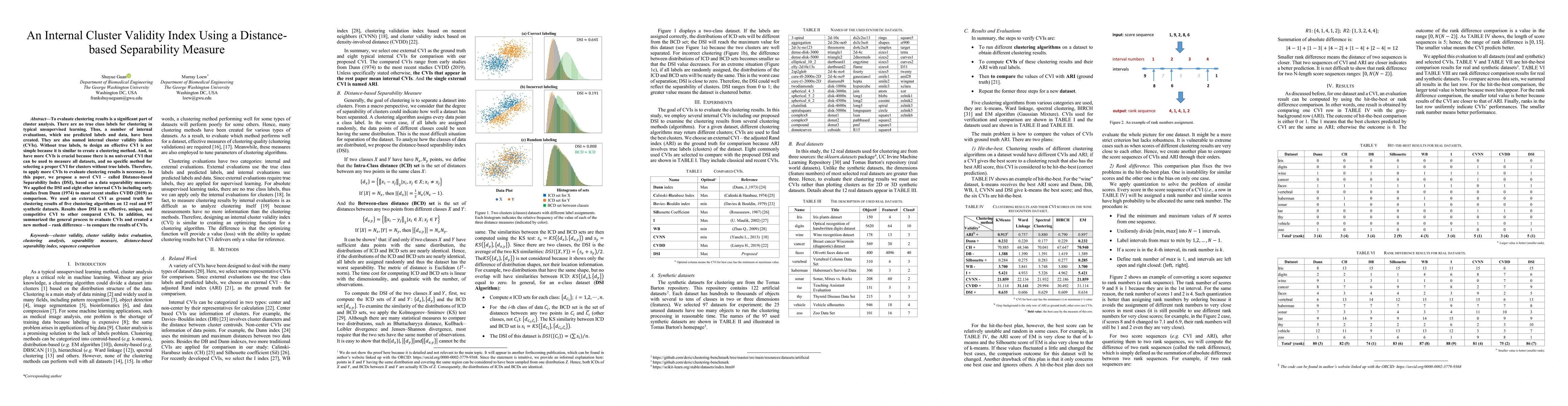 This paper proposes a novel internal cluster validity index called Distance-based Separability Index (DSI) to evaluate clustering results in unsupervised learning. The DSI is shown to be effective and competitive compared to other internal CVIs across various datasets and clustering algorithms.