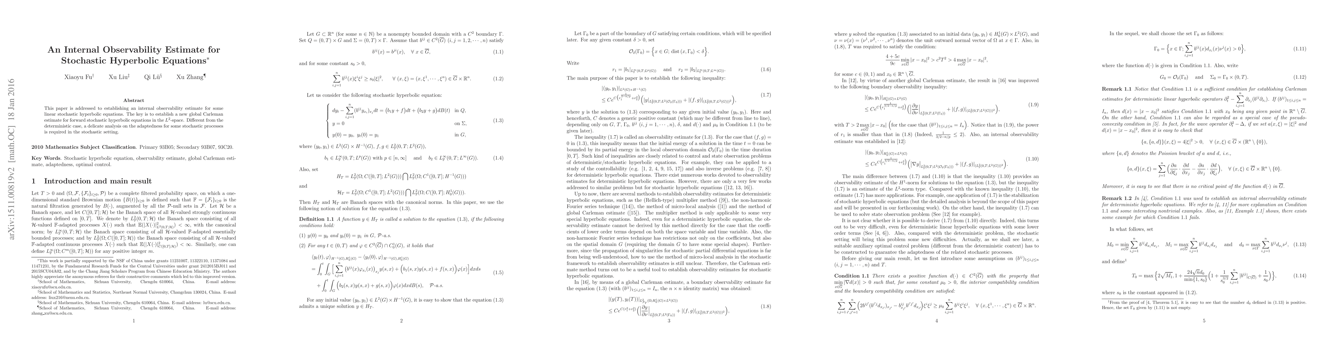 This paper establishes an internal observability estimate for linear stochastic hyperbolic equations, relying on a novel global Carleman estimate in the $L^2$-space, with a focus on the adaptedness of stochastic processes in the analysis.