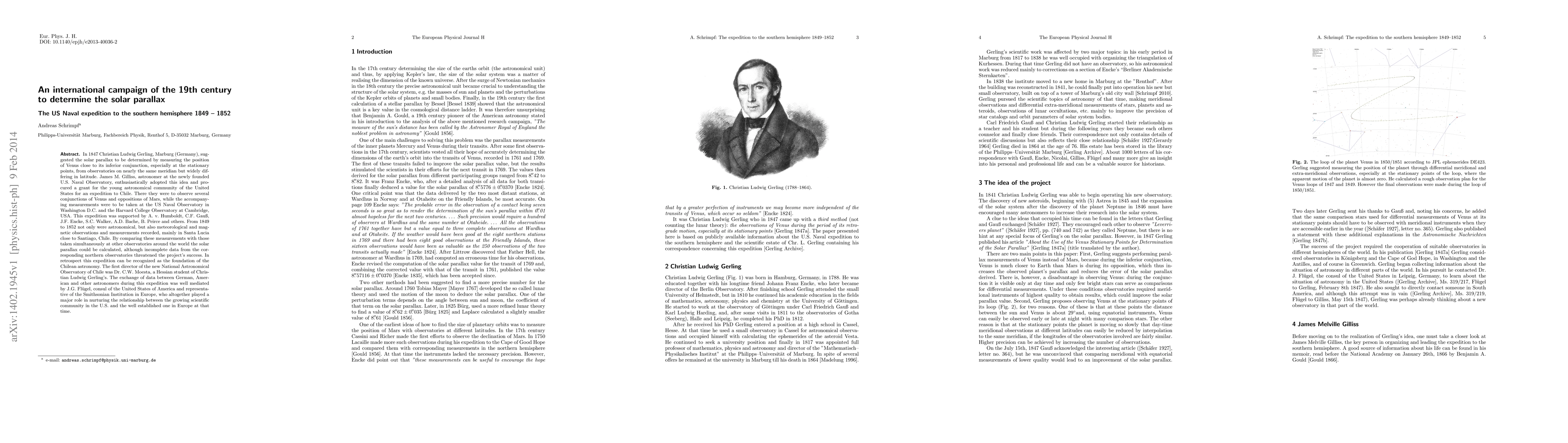 In 1847 Christian Ludwig Gerling, Marburg (Germany), suggested the solar parallax to be determined by measuring the position of Venus close to its inferior conjunction, especially at the stationary points, from observatories on nearly the same meridian but widely differing in latitude. James M. Gilliss,astronomer at the newly founded U.S. Naval Observatory, enthusiastically adopted this idea and procured a grant for the young astronomical community of the United States for an expedition to Chile. There they were to observe several conjunctions of Venus and oppositions of Mars, while the accompanying measurements were to be taken at the US Naval Observatory in Washington D.C. and the Harvard College Observatory at Cambridge, USA. This expedition was supported by A. v. Humboldt, C.F. Gau{\ss}, J.F. Encke, S.C. Walker, A.D. Bache, B. Peirce and others. From 1849 to 1852 not only were astronomical, but also meteorological and magnetic observations and measurements recorded, mainly in Santa Lucia close to Santiago, Chile. By comparing these measurements with those taken simultaneously at other observatories around the world the solar parallax could be calculated, although incomplete data from the corresponding northern observatories threatened the project's success. In retrospect this expedition can be recognized as the foundation of the Chilean astronomy. The first director of the new National Astronomical Observatory of Chile was Dr. C.W. Moesta, a Hessian student of Christian Ludwig Gerling's. The exchange of data between German, American and other astronomers during this expedition was well mediated by J.G. Fl\"ugel, consul of the United States of America and representative of the Smithsonian Institution in Europe, who altogether played a major role in nurturing the relationship between the growing scientific community in the U.S. and the well established one in Europe at that time.