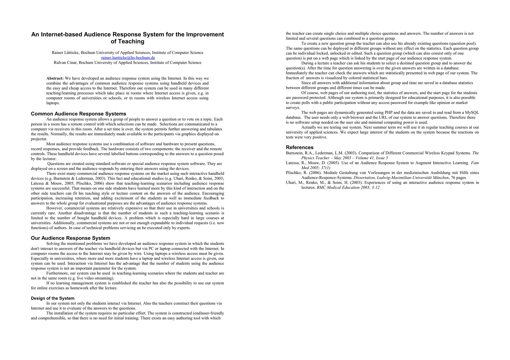We have developed an Internet-based audience response system (called ARSBO). In this way we combine the advantages of common audience response systems using handheld devices and the easy and cheap access to the Internet. Evaluations of audience response systems in the literature have shown their success: encouraging participation of the students as well as immediate feedback to answers to the whole group for evaluational purposes of the teacher. However, commercial systems are relatively expensive and the number of students in such a teaching-learning scenario is limited. ARSBO solves these problems. Using the Internet (e.g. in computer rooms or by wireless Internet access) there are no special costs and the number of participating students is not limited. ARSBO is very easy to use for students as well as for the construction of new questions with possible answers and for the visualization of statistical results to questions.