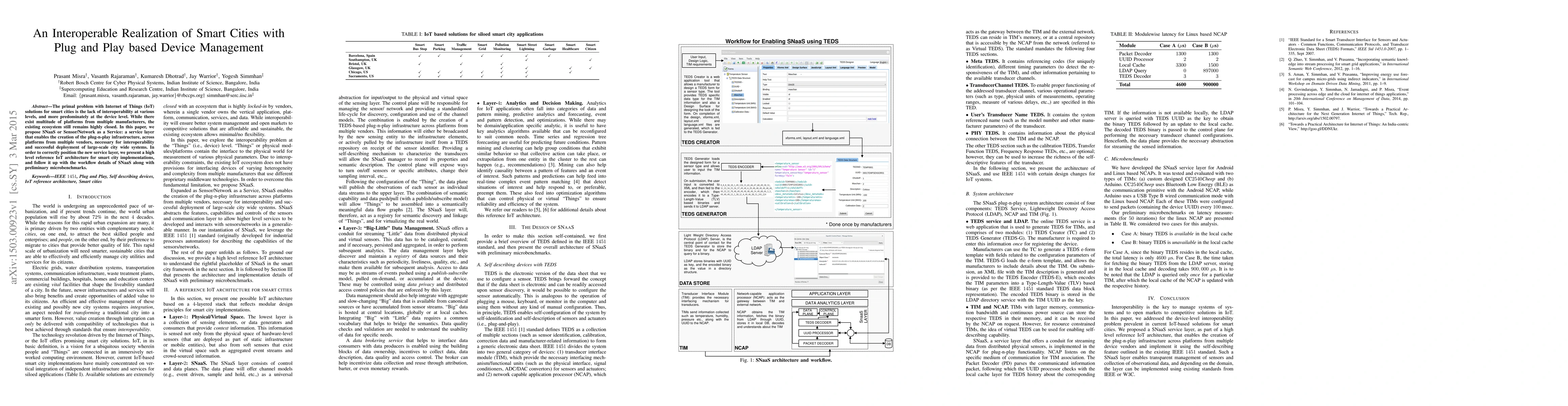 The primal problem with Internet of Things (IoT) solutions for smart cities is the lack of interoperability at various levels, and more predominately at the device level. While there exist multitude of platforms from multiple manufacturers, the existing ecosystem still remains highly closed. In this paper, we propose SNaaS or Sensor/Network as a Service: a service layer that enables the creation of the plug-n-play infrastructure, across platforms from multiple vendors, necessary for interoperability and successful deployment of large-scale city wide systems. In order to correctly position the new service layer, we present a high level reference IoT architecture for smart city implementations, and follow it up with the workflow details of SNaaS along with preliminary microbenchmarks.