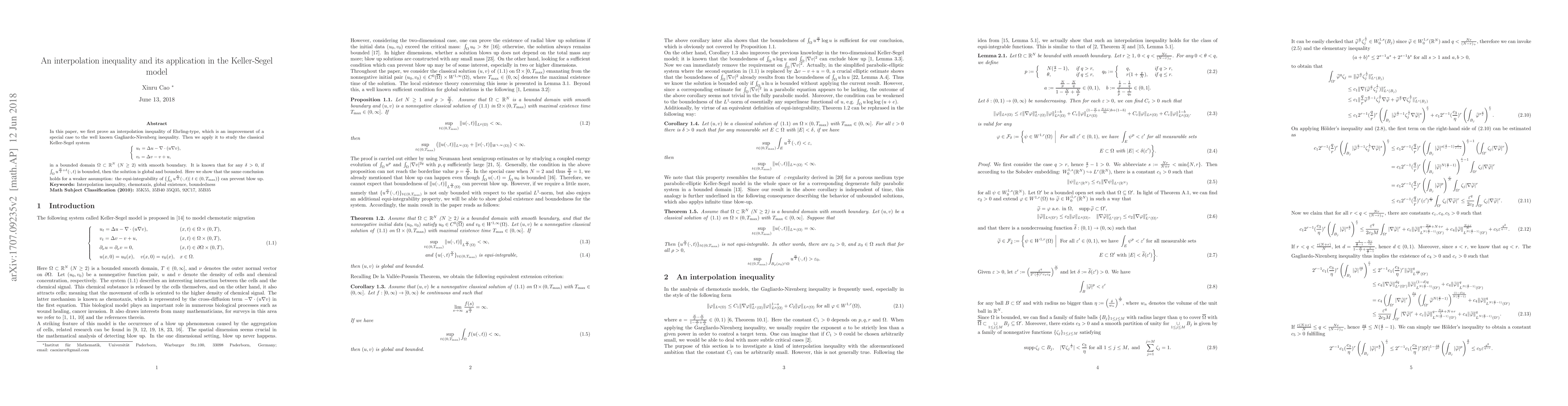 This paper proves an improved interpolation inequality and applies it to the Keller-Segel model, demonstrating that equi-integrability of $u^{N/2}$ over time suffices for global existence and boundedness of solutions, even under weaker conditions.