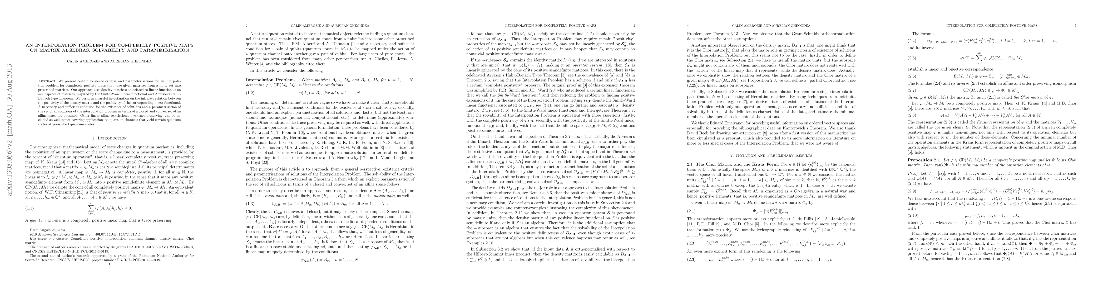 This paper presents existence criteria and parameterizations for an interpolation problem concerning completely positive maps on matrix algebras. Utilizing density matrices linked to linear functionals on *-subspaces of matrices, the research establishes necessary and sufficient conditions for solution existence and parametrizes the solution set as a closed, convex subset of an affine space. The methodology draws from the Smith-Ward linear functional and Arveson's Hahn-Banach theorem, with potential applications in quantum channels and state generation.