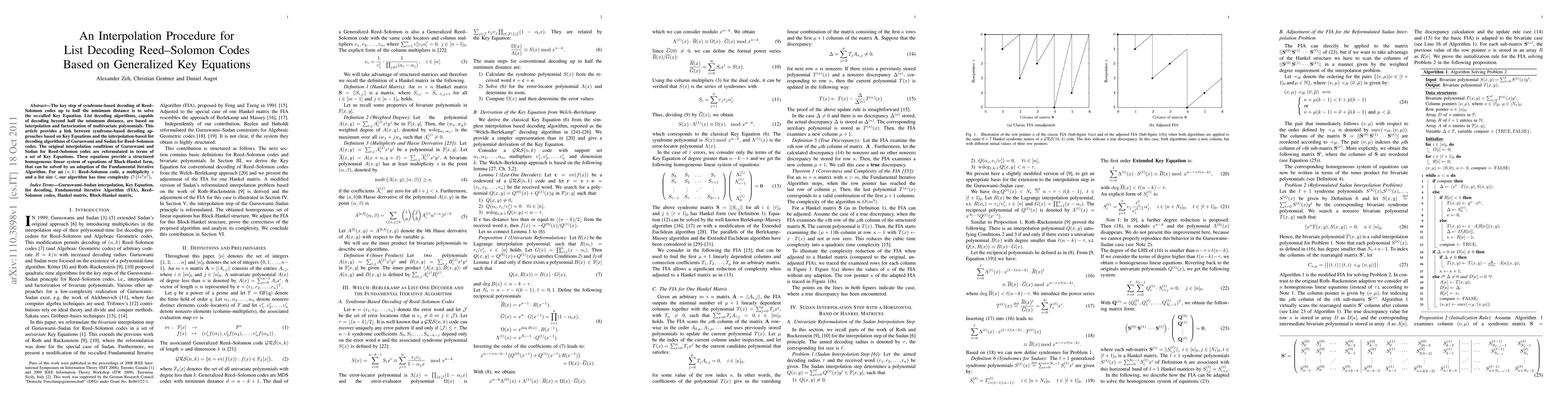 The paper introduces a novel interpolation procedure for list decoding Reed-Solomon codes based on generalized Key Equations, providing a structured Block-Hankel linear system solvable by an adapted FIA.