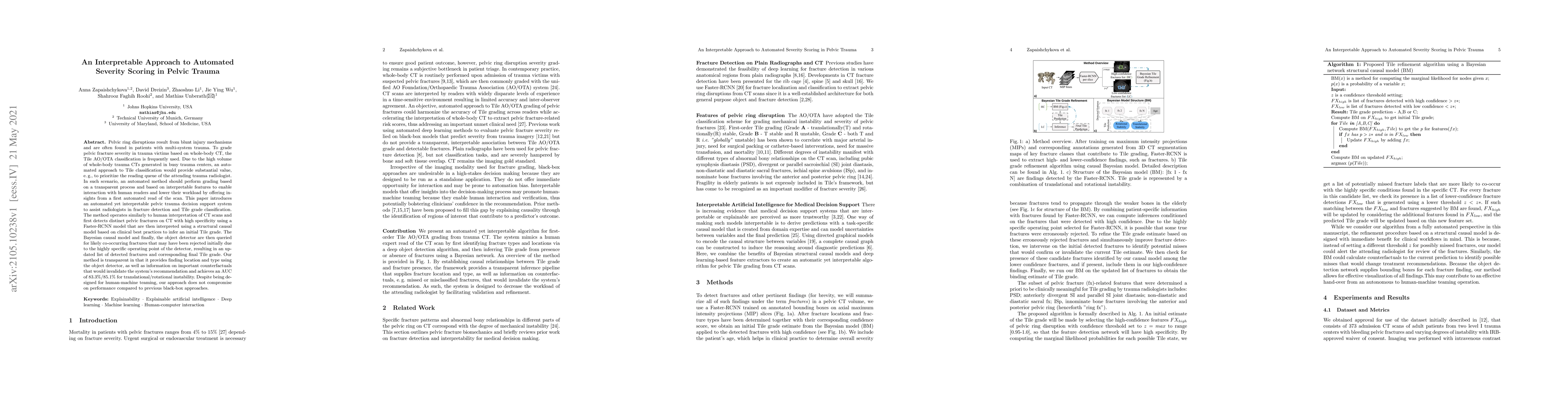 Pelvic ring disruptions result from blunt injury mechanisms and are often found in patients with multi-system trauma. To grade pelvic fracture severity in trauma victims based on whole-body CT, the Tile AO/OTA classification is frequently used. Due to the high volume of whole-body trauma CTs generated in busy trauma centers, an automated approach to Tile classification would provide substantial value, e.,g., to prioritize the reading queue of the attending trauma radiologist. In such scenario, an automated method should perform grading based on a transparent process and based on interpretable features to enable interaction with human readers and lower their workload by offering insights from a first automated read of the scan. This paper introduces an automated yet interpretable pelvic trauma decision support system to assist radiologists in fracture detection and Tile grade classification. The method operates similarly to human interpretation of CT scans and first detects distinct pelvic fractures on CT with high specificity using a Faster-RCNN model that are then interpreted using a structural causal model based on clinical best practices to infer an initial Tile grade. The Bayesian causal model and finally, the object detector are then queried for likely co-occurring fractures that may have been rejected initially due to the highly specific operating point of the detector, resulting in an updated list of detected fractures and corresponding final Tile grade. Our method is transparent in that it provides finding location and type using the object detector, as well as information on important counterfactuals that would invalidate the system's recommendation and achieves an AUC of 83.3%/85.1% for translational/rotational instability. Despite being designed for human-machine teaming, our approach does not compromise on performance compared to previous black-box approaches.