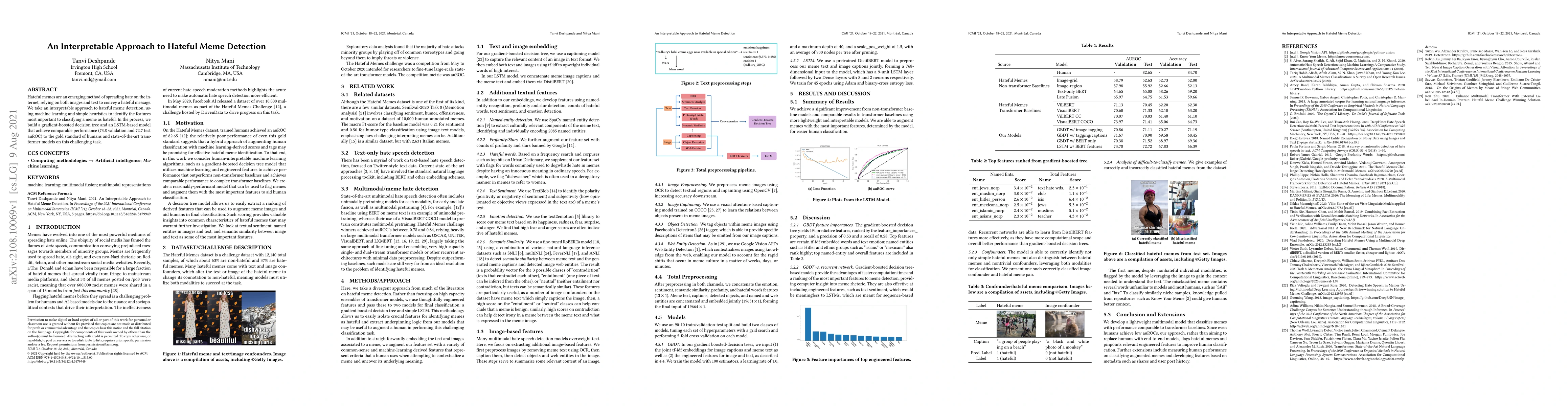 This paper proposes an interpretable method for detecting hateful memes using machine learning and heuristics. It builds gradient-boosted decision trees and LSTM models that achieve comparable performance to human raters and advanced transformer models, highlighting the importance of interpretability in such tasks.