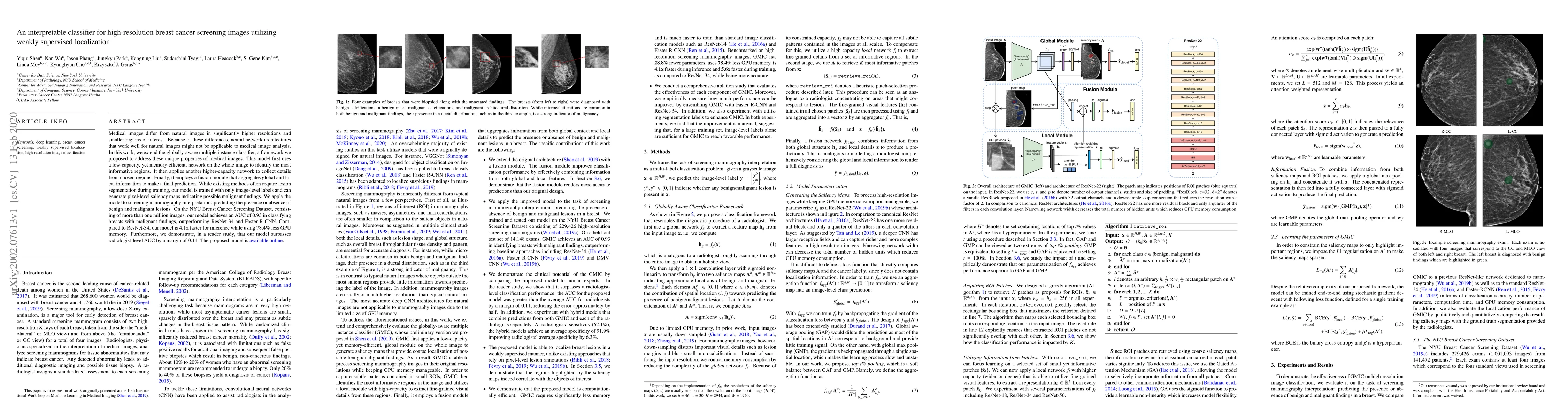 Medical images differ from natural images in significantly higher resolutions and smaller regions of interest. Because of these differences, neural network architectures that work well for natural images might not be applicable to medical image analysis. In this work, we extend the globally-aware multiple instance classifier, a framework we proposed to address these unique properties of medical images. This model first uses a low-capacity, yet memory-efficient, network on the whole image to identify the most informative regions. It then applies another higher-capacity network to collect details from chosen regions. Finally, it employs a fusion module that aggregates global and local information to make a final prediction. While existing methods often require lesion segmentation during training, our model is trained with only image-level labels and can generate pixel-level saliency maps indicating possible malignant findings. We apply the model to screening mammography interpretation: predicting the presence or absence of benign and malignant lesions. On the NYU Breast Cancer Screening Dataset, consisting of more than one million images, our model achieves an AUC of 0.93 in classifying breasts with malignant findings, outperforming ResNet-34 and Faster R-CNN. Compared to ResNet-34, our model is 4.1x faster for inference while using 78.4% less GPU memory. Furthermore, we demonstrate, in a reader study, that our model surpasses radiologist-level AUC by a margin of 0.11. The proposed model is available online: https://github.com/nyukat/GMIC.