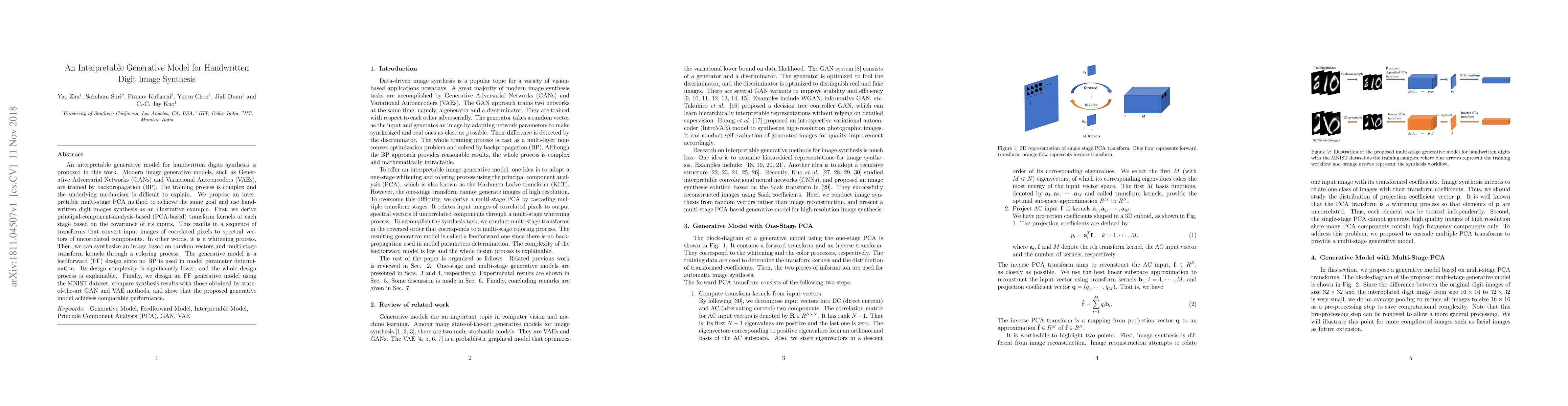 This paper proposes an interpretable generative model for handwritten digit image synthesis using a multi-stage PCA method instead of complex GANs or VAEs. It achieves comparable performance to state-of-the-art methods while maintaining a simpler, explainable feedforward design.