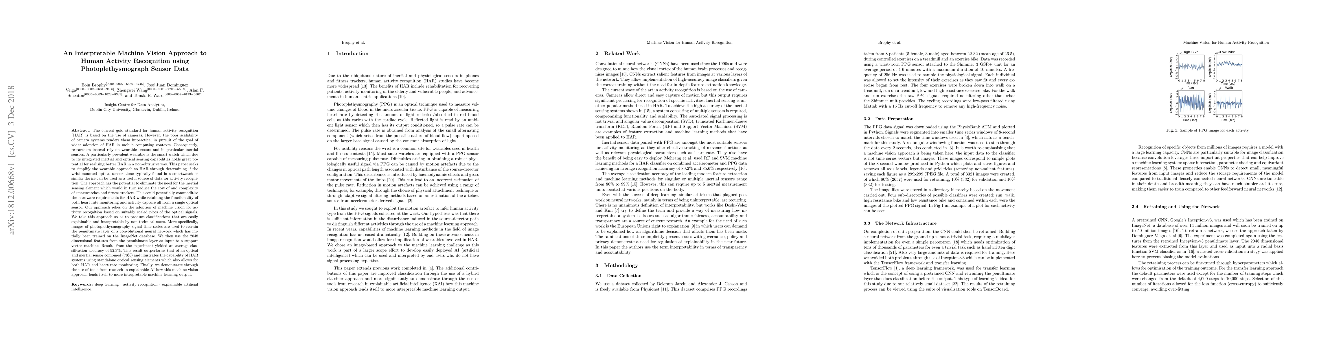 The current gold standard for human activity recognition (HAR) is based on the use of cameras. However, the poor scalability of camera systems renders them impractical in pursuit of the goal of wider adoption of HAR in mobile computing contexts. Consequently, researchers instead rely on wearable sensors and in particular inertial sensors. A particularly prevalent wearable is the smart watch which due to its integrated inertial and optical sensing capabilities holds great potential for realising better HAR in a non-obtrusive way. This paper seeks to simplify the wearable approach to HAR through determining if the wrist-mounted optical sensor alone typically found in a smartwatch or similar device can be used as a useful source of data for activity recognition. The approach has the potential to eliminate the need for the inertial sensing element which would in turn reduce the cost of and complexity of smartwatches and fitness trackers. This could potentially commoditise the hardware requirements for HAR while retaining the functionality of both heart rate monitoring and activity capture all from a single optical sensor. Our approach relies on the adoption of machine vision for activity recognition based on suitably scaled plots of the optical signals. We take this approach so as to produce classifications that are easily explainable and interpretable by non-technical users. More specifically, images of photoplethysmography signal time series are used to retrain the penultimate layer of a convolutional neural network which has initially been trained on the ImageNet database. We then use the 2048 dimensional features from the penultimate layer as input to a support vector machine. Results from the experiment yielded an average classification accuracy of 92.3%. This result outperforms that of an optical and inertial sensor combined (78%) and illustrates the capability of HAR systems using...