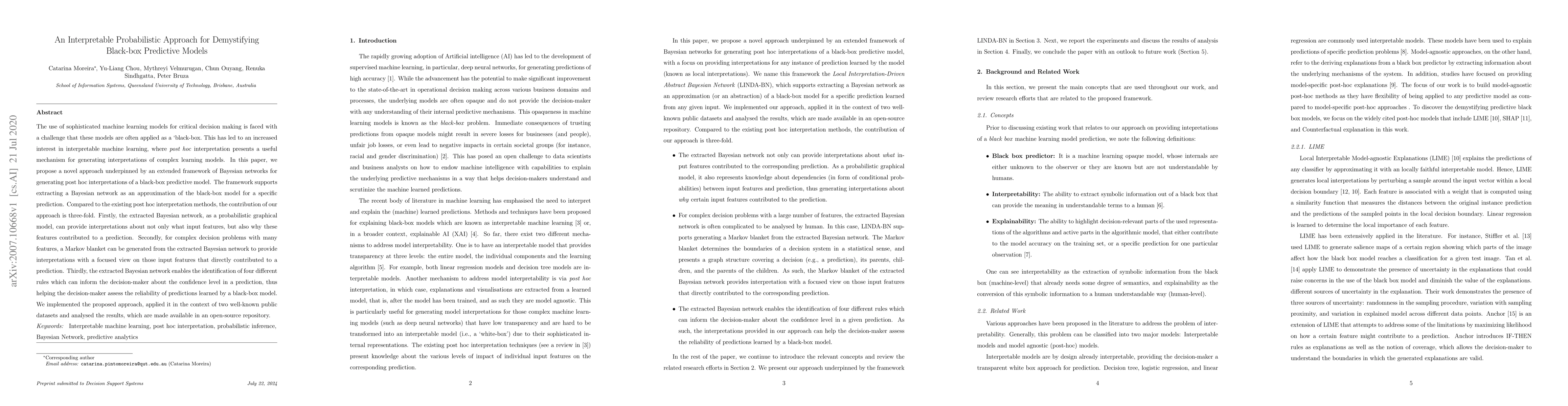 This paper proposes an interpretable probabilistic approach using extended Bayesian networks to generate post hoc interpretations for black-box predictive models. The method provides insights into both feature contributions and prediction confidence, and it focuses on relevant features through Markov blankets.