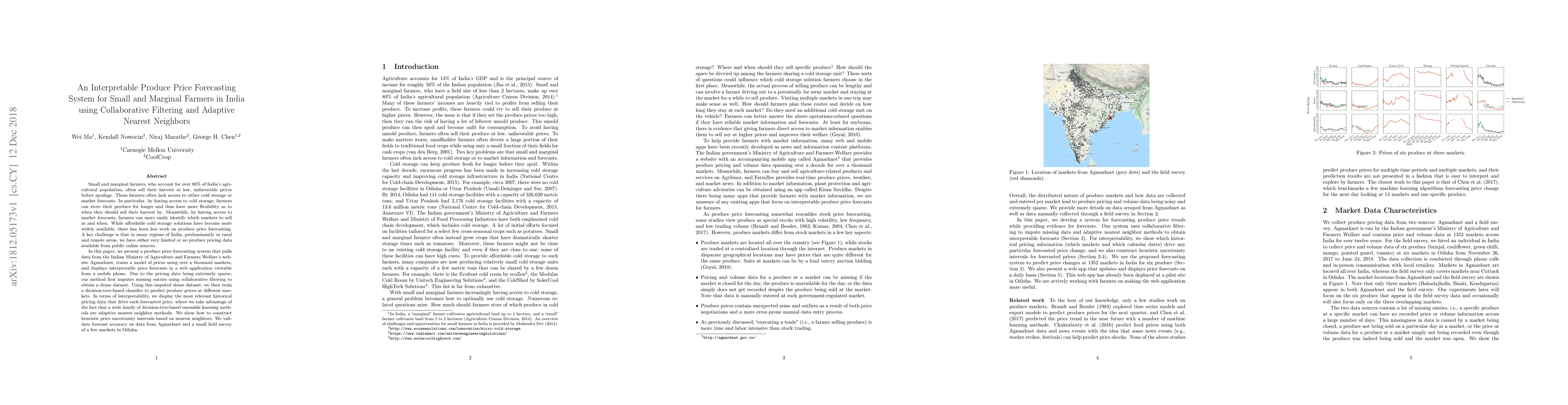Small and marginal farmers, who account for over 80% of India's agricultural population, often sell their harvest at low, unfavorable prices before spoilage. These farmers often lack access to either cold storage or market forecasts. In particular, by having access to cold storage, farmers can store their produce for longer and thus have more flexibility as to when they should sell their harvest by. Meanwhile, by having access to market forecasts, farmers can more easily identify which markets to sell at and when. While affordable cold storage solutions have become more widely available, there has been less work on produce price forecasting. A key challenge is that in many regions of India, predominantly in rural and remote areas, we have either very limited or no produce pricing data available from public online sources. In this paper, we present a produce price forecasting system that pulls data from the Indian Ministry of Agriculture and Farmers Welfare's website Agmarknet, trains a model of prices using over a thousand markets, and displays interpretable price forecasts in a web application viewable from a mobile phone. Due to the pricing data being extremely sparse, our method first imputes missing entries using collaborative filtering to obtain a dense dataset. Using this imputed dense dataset, we then train a decision-tree-based classifier to predict produce prices at different markets. In terms of interpretability, we display the most relevant historical pricing data that drive each forecasted price, where we take advantage of the fact that a wide family of decision-tree-based ensemble learning methods are adaptive nearest neighbor methods. We show how to construct heuristic price uncertainty intervals based on nearest neighbors. We validate forecast accuracy on data from Agmarknet and a small field survey of a few markets in Odisha.