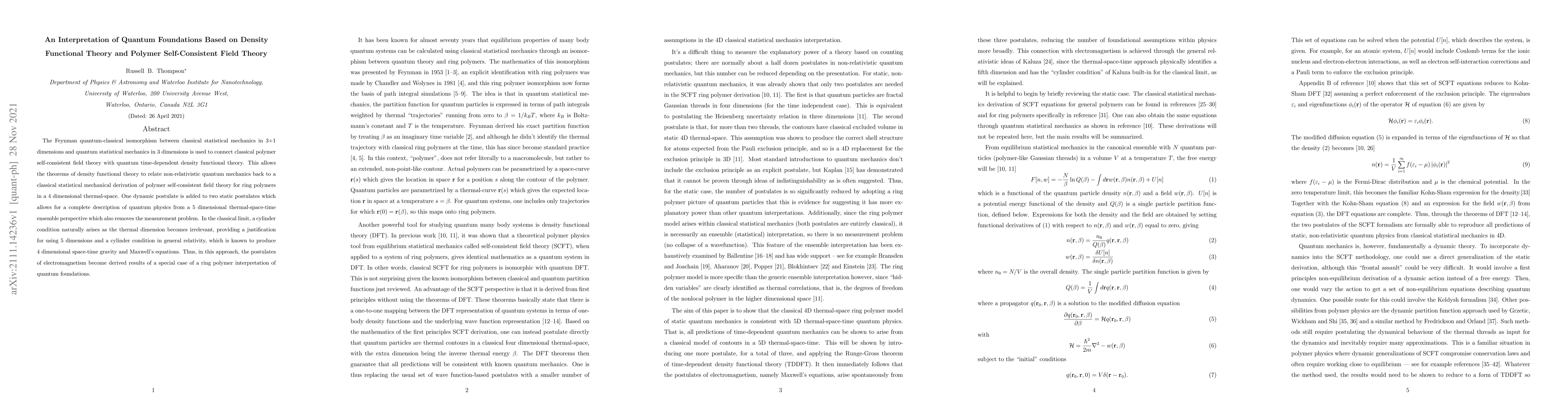 The Feynman quantum-classical isomorphism between classical statistical mechanics in 3+1 dimensions and quantum statistical mechanics in 3 dimensions is used to connect classical polymer self-consistent field theory with quantum time-dependent density functional theory. This allows the theorems of density functional theory to relate non-relativistic quantum mechanics back to a classical statistical mechanical derivation of polymer self-consistent field theory for ring polymers in a 4 dimensional thermal-space. One dynamic postulate is added to two static postulates which allows for a complete description of quantum physics from a 5 dimensional thermal-space-time ensemble perspective which also removes the measurement problem. In the classical limit, a cylinder condition naturally arises as the thermal dimension becomes irrelevant, providing a justification for using 5 dimensions and a cylinder condition in general relativity, which is known to produce 4 dimensional space-time gravity and Maxwell's equations. Thus, in this approach, the postulates of electromagnetism become derived results of a special case of a ring polymer interpretation of quantum foundations.