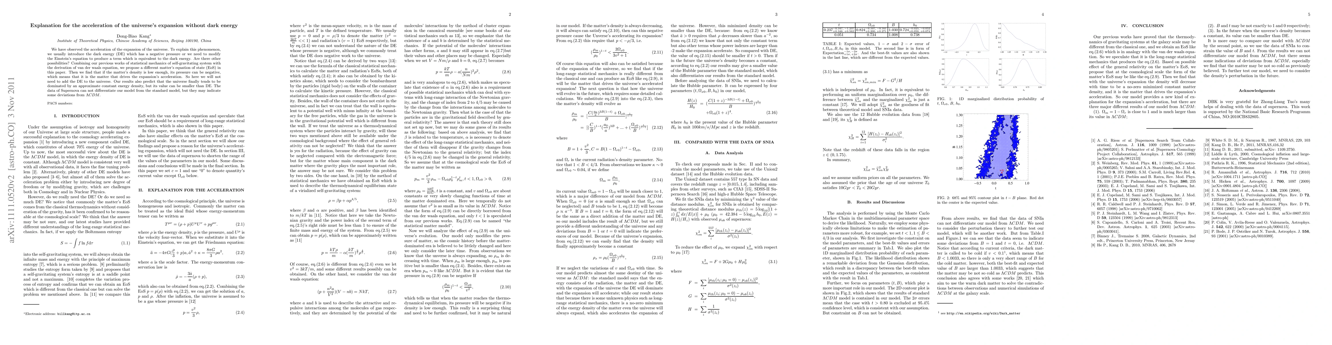 We have observed the acceleration of the expansion of the universe. To explain this phenomenon, we usually introduce the dark energy (DE) which has a negative pressure or we need to modify the Einstein's equation to produce a term which is equivalent to the dark energy. Are there other possibilities? Combining our previous works of statistical mechanics of self-gravitating system with the derivation of van der waals equation, we propose a different matter's equation of state (EoS) in this paper. Then we find that if the matter's density is low enough, its pressure can be negative, which means that it is the matter that drives the expansion's acceleration. So here we will not need to add the DE to the universe. Our results also predict that the universe finally tends to be dominated by an approximate constant energy density, but its value can be smaller than DE. The data of Supernova can not differentiate our model from the standard model, but they may indicate some deviations from LCDM.