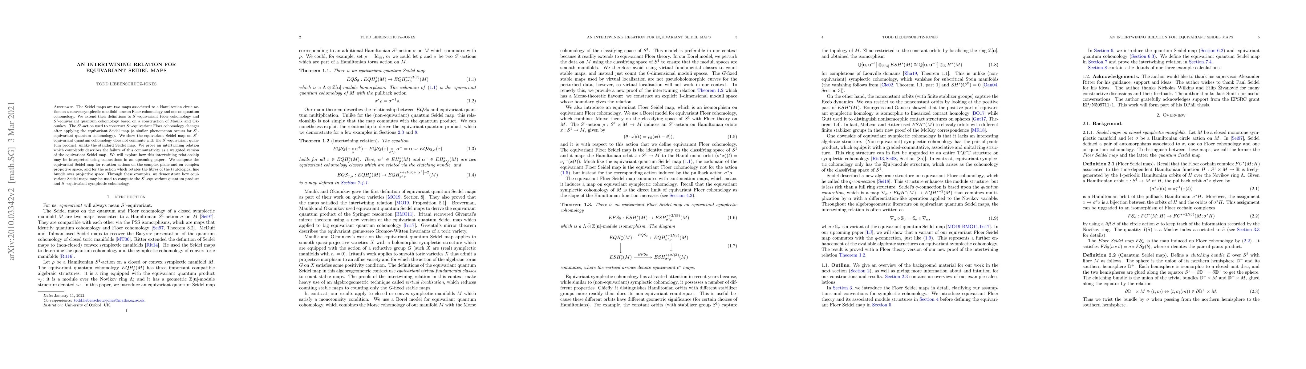 The Seidel maps are two maps associated to a Hamiltonian circle action on a convex symplectic manifold, one on Floer cohomology and one on quantum cohomology. We extend their definitions to $S^1$-equivariant Floer cohomology and $S^1$-equivariant quantum cohomology based on a construction of Maulik and Okounkov. The $S^1$-action used to construct $S^1$-equivariant Floer cohomology changes after applying the equivariant Seidel map (a similar phenomenon occurs for $S^1$-equivariant quantum cohomology). We show the equivariant Seidel map on $S^1$-equivariant quantum cohomology does not commute with the $S^1$-equivariant quantum product, unlike the standard Seidel map. We prove an intertwining relation which completely describes the failure of this commutativity as a weighted version of the equivariant Seidel map. We will explore how this intertwining relationship may be interpreted using connections in an upcoming paper. We compute the equivariant Seidel map for rotation actions on the complex plane and on complex projective space, and for the action which rotates the fibres of the tautological line bundle over projective space. Through these examples, we demonstrate how equivariant Seidel maps may be used to compute the $S^1$-equivariant quantum product and $S^1$-equivariant symplectic cohomology.
