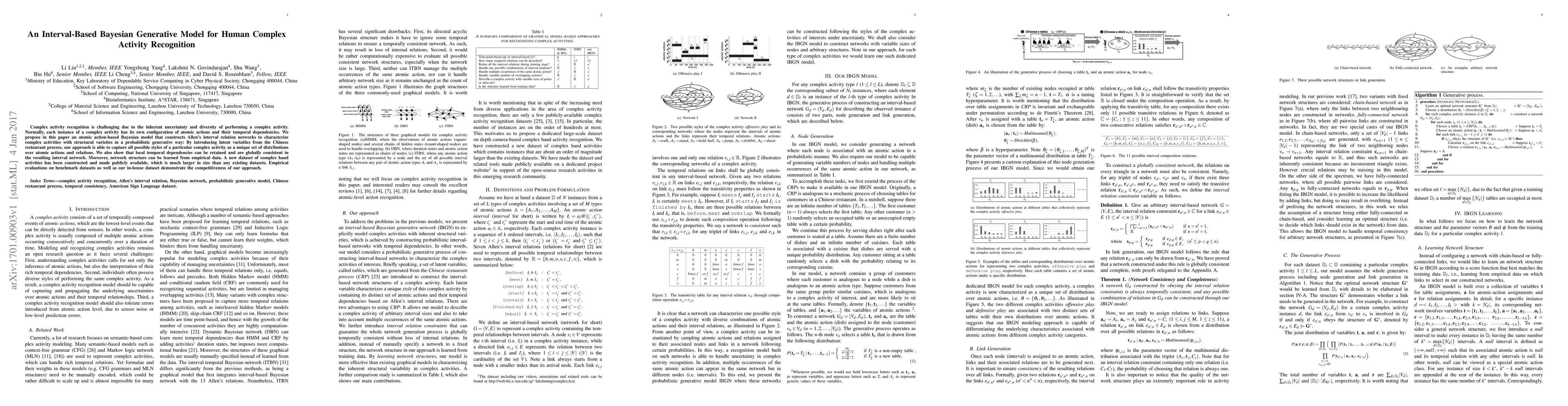This paper proposes a Bayesian generative model to recognize complex human activities by capturing unique distributions over atomic actions and temporal dependencies. The approach demonstrates competitive performance on benchmark datasets and introduces a new dataset of complex hand activities.