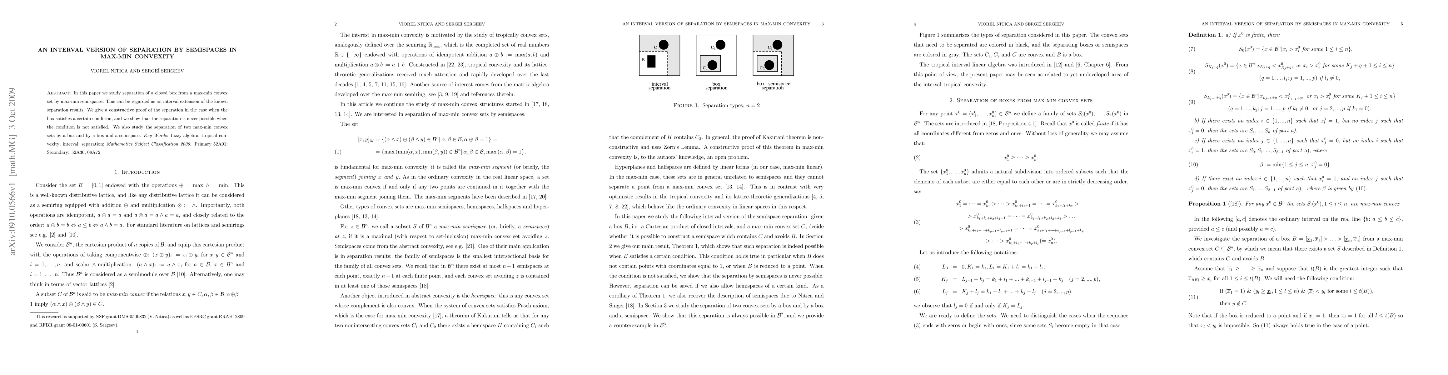 The paper introduces an interval version of separation by semispaces in max-min convexity, providing constructive proofs and conditions for separation.