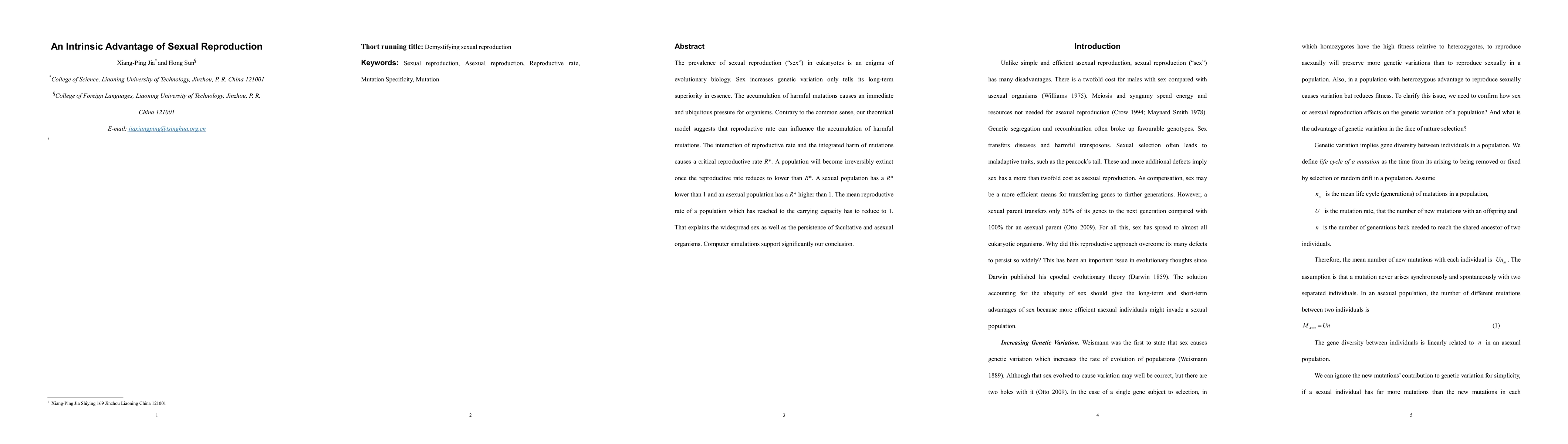 The prevalence of sexual reproduction ("sex") in eukaryotes is an enigma of evolutionary biology. Sex increases genetic variation only tells its long-term superiority in essence. The accumulation of harmful mutations causes an immediate and ubiquitous pressure for organisms. Contrary to the common sense, our theoretical model suggests that reproductive rate can influence initiatively the accumulation of harmful mutations. The interaction of reproductive rate and the integrated harm of mutations causes a critical reproductive rate R*. A population will become irreversibly extinct once the reproductive rate reduces to lower than R*. A sexual population has a R* lower than 1 and an asexual population has a R* higher than 1. The mean reproductive rate of a population reached to the carrying capacity has to reduce to 1. That explains the widespread sex as well as the persistence of facultative and asexual organisms. Computer simulations support significantly our conclusion.