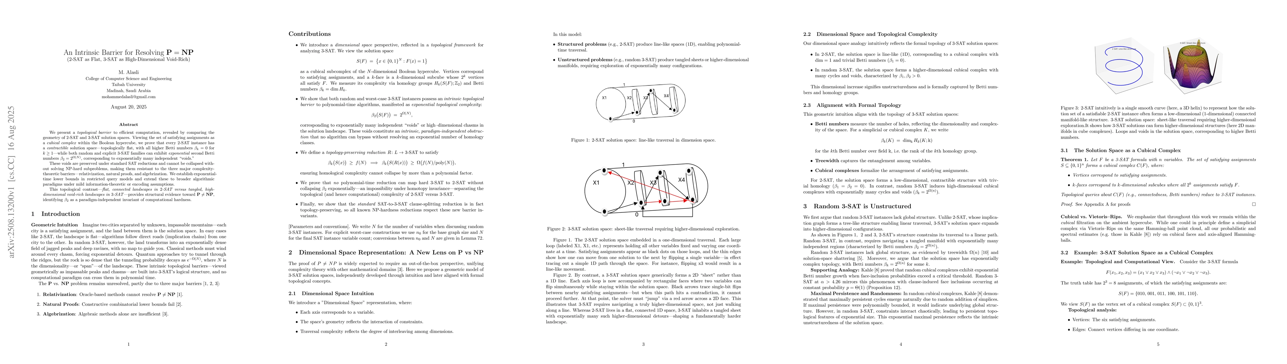 We present a topological barrier to efficient computation, revealed by comparing the geometry of 2 SAT and 3 SAT solution spaces. Viewing the set of satisfying assignments as a cubical complex within the Boolean hypercube, we prove that every 2 SAT instance has a contractible solution space, topologically flat, with all higher Betti numbers bk equals 0 for k greater than or equal 1, while both random and explicit 3 SAT families can exhibit exponential second Betti numbers, corresponding to exponentially many independent voids. These voids are preserved under standard SAT reductions and cannot be collapsed without solving NP-hard subproblems, making them resistant to the three major complexity theoretic barriers, relativization, natural proofs, and algebrization. We establish exponential time lower bounds in restricted query models and extend these to broader algorithmic paradigms under mild information-theoretic or encoding assumptions. This topological contrast flat, connected landscapes in 2 SAT versus tangled, high-dimensional void-rich landscapes in 3 SAT, provides structural evidence toward P does not equal NP, identifying b2 as a paradigm-independent invariant of computational hardness.