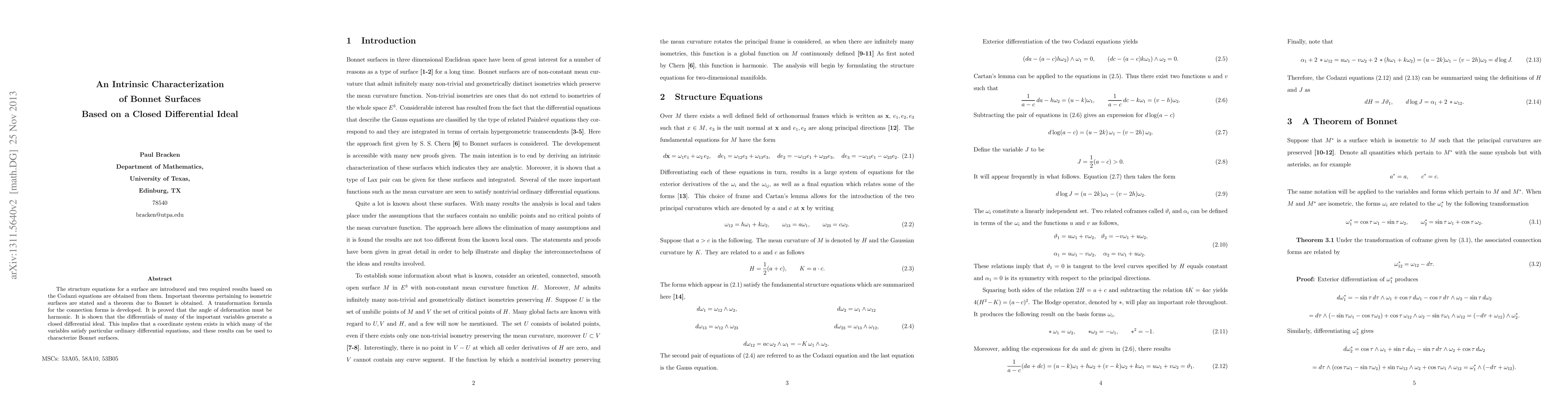 The structure equations for a surface are introduced and two required results based on the Codazzi equations are obtained from them. Important theorems pertaining to isometric surfaces are stated and a theorem of Bonnet is obtained. A tranformation formula for the connection forms is developed. It is proved that the angle of deformation must be harmonic. It is shown that the differentials of many of the important variables generate a closed differential ideal. This implies that a coordinate system exists in which many of the variables satisfy particular ordinary differential equations and these results can be used to characterize Bonnet surfaces.