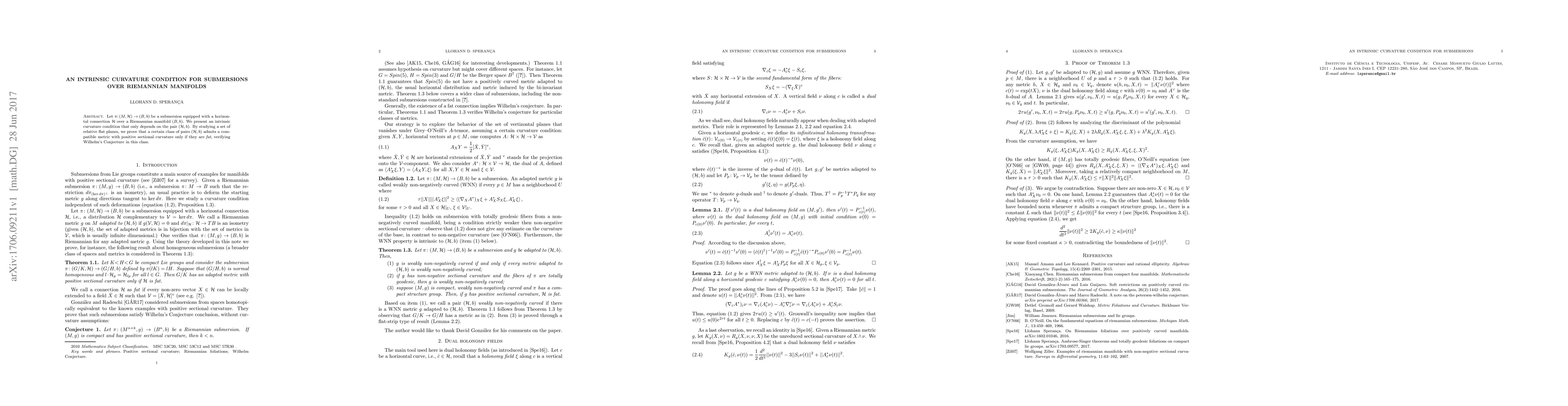 Let $\pi{:}\,(M,\mathcal{H})\to (B,b)$ be a submersion equipped with a horizontal connection $\cal H$ over a Riemannian manifold $(B,b)$. We present an intrinsic curvature condition that only depends on the pair $(\cal H,b)$. By studying a set of relative flat planes, we prove that a certain class of pairs $(\cal H,b)$ admits a compatible metric with positive sectional curvature only if they are \textit{fat}, verifying Wilhelm's Conjecture in this class.