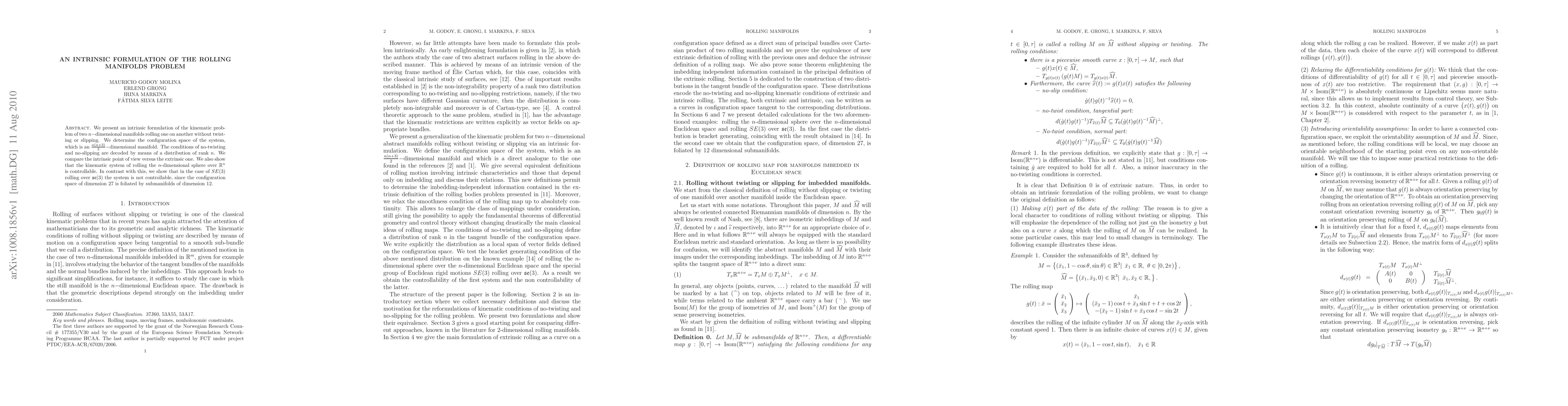 This paper formulates the rolling manifolds problem intrinsically, determining the configuration space and conditions for no-twisting and no-slipping. It finds the system of a rolling $n$-dimensional sphere over $\mathbb R^n$ is controllable, while the $SE(3)$ rolling over $\mathfrak{se}(3)$ system is not, due to its foliated configuration space.