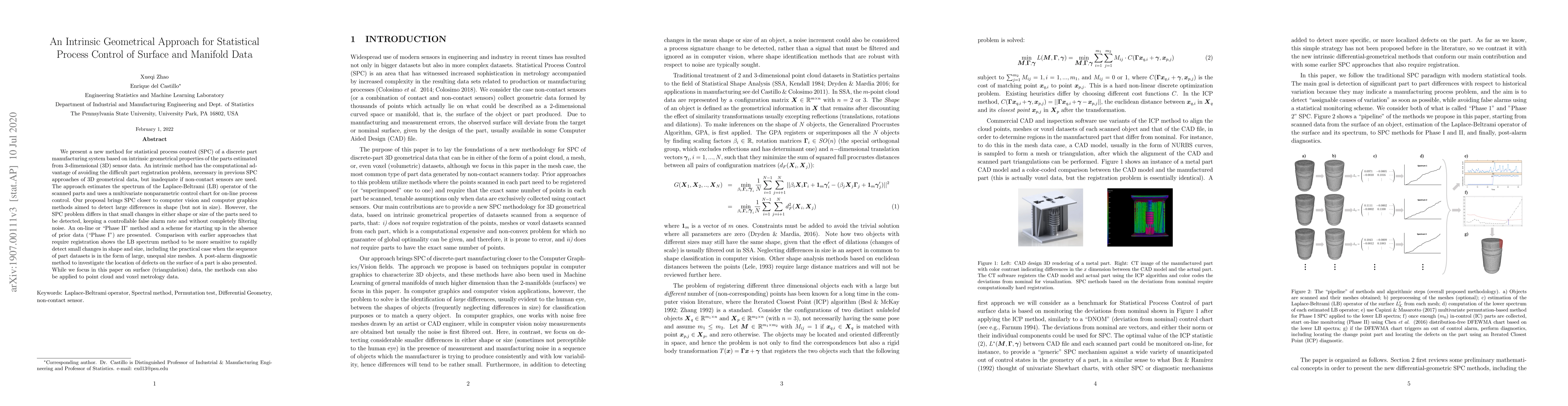 This paper introduces an intrinsic geometrical approach for statistical process control of surface and manifold data, utilizing the spectrum of the Laplace-Beltrami operator to detect small changes in shape and size without requiring part registration. The method is shown to be more sensitive than previous approaches, especially for large, unequal size meshes.
