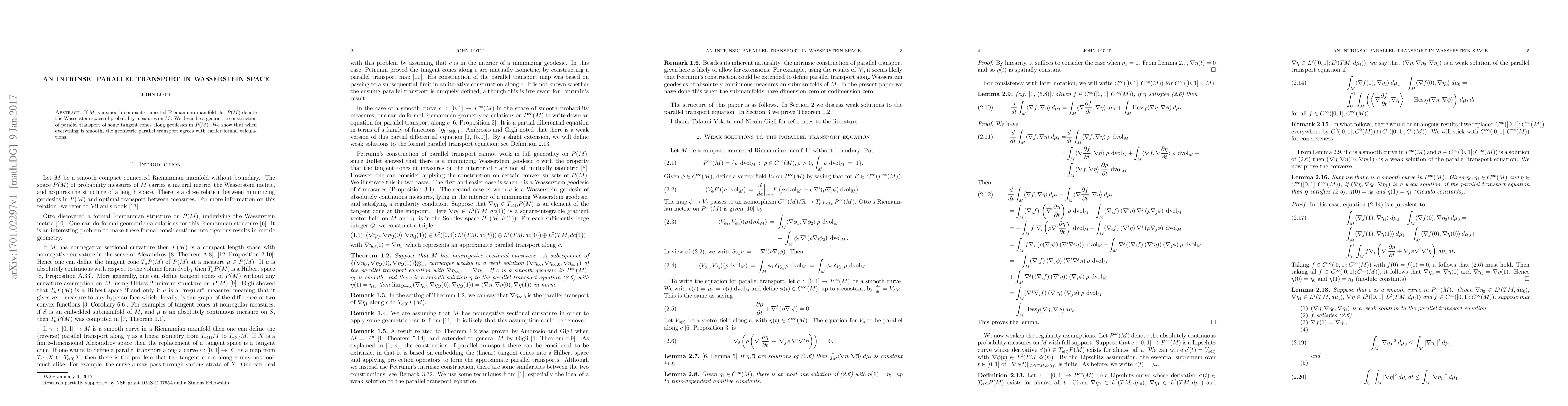 If M is a smooth compact connected Riemannian manifold, let P(M) denote the Wasserstein space of probability measures on M. We describe a geometric construction of parallel transport of some tangent cones along geodesics in P(M). We show that when everything is smooth, the geometric parallel transport agrees with earlier formal calculations.