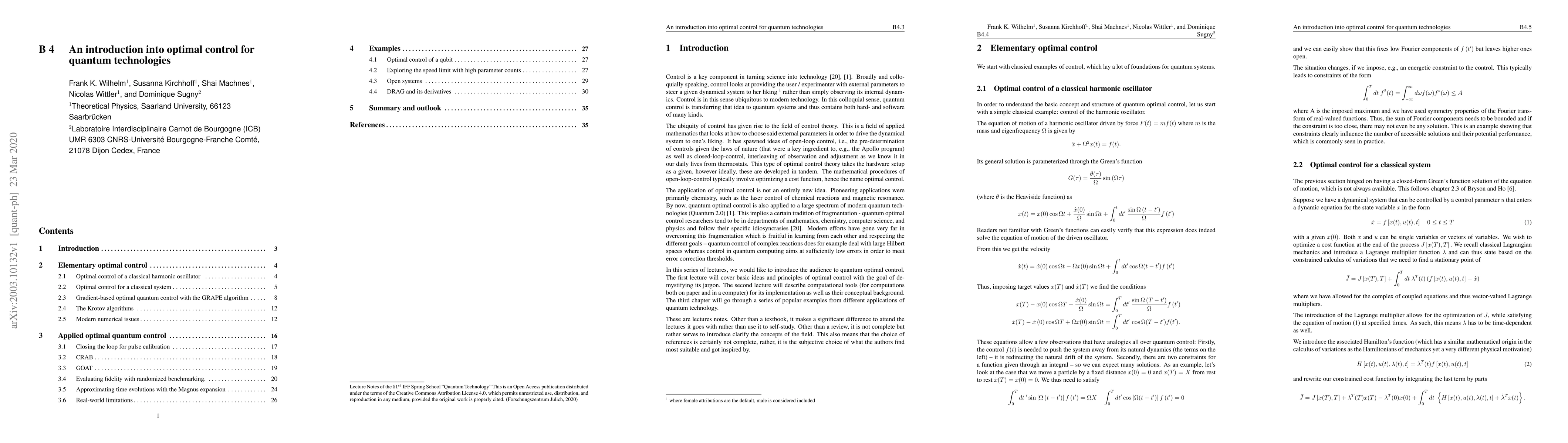 In this series of lectures, we would like to introduce the audience to quantum optimal control. The first lecture will cover basic ideas and principles of optimal control with the goal of demystifying its jargon. The second lecture will describe computational tools (for computations both on paper and in a computer) for its implementation as well as their conceptual background. The third chapter will go through a series of popular examples from different applications of quantum technology.