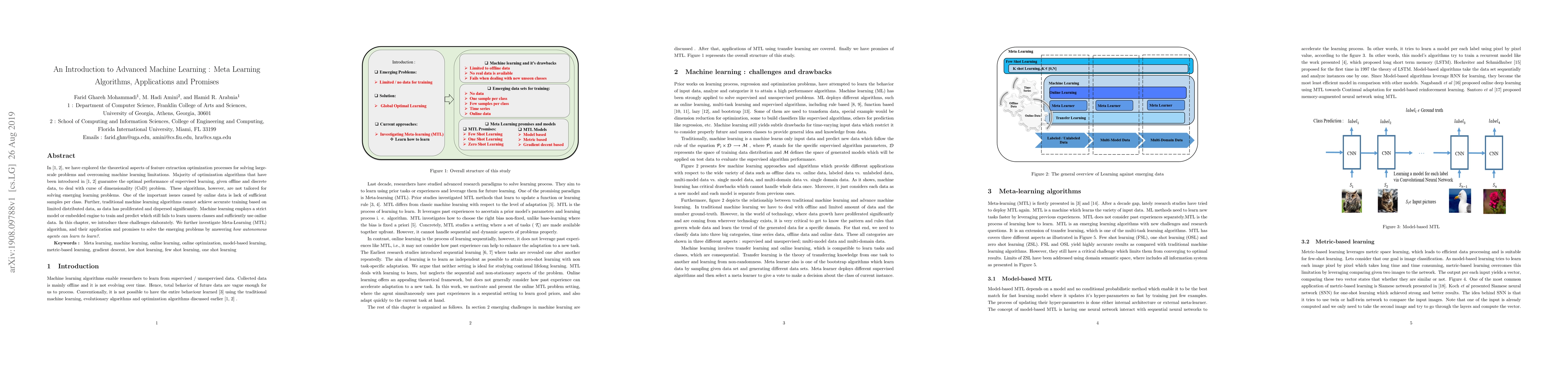 In [1, 2], we have explored the theoretical aspects of feature extraction optimization processes for solving largescale problems and overcoming machine learning limitations. Majority of optimization algorithms that have been introduced in [1, 2] guarantee the optimal performance of supervised learning, given offline and discrete data, to deal with curse of dimensionality (CoD) problem. These algorithms, however, are not tailored for solving emerging learning problems. One of the important issues caused by online data is lack of sufficient samples per class. Further, traditional machine learning algorithms cannot achieve accurate training based on limited distributed data, as data has proliferated and dispersed significantly. Machine learning employs a strict model or embedded engine to train and predict which still fails to learn unseen classes and sufficiently use online data. In this chapter, we introduce these challenges elaborately. We further investigate Meta-Learning (MTL) algorithm, and their application and promises to solve the emerging problems by answering how autonomous agents can learn to learn?.
