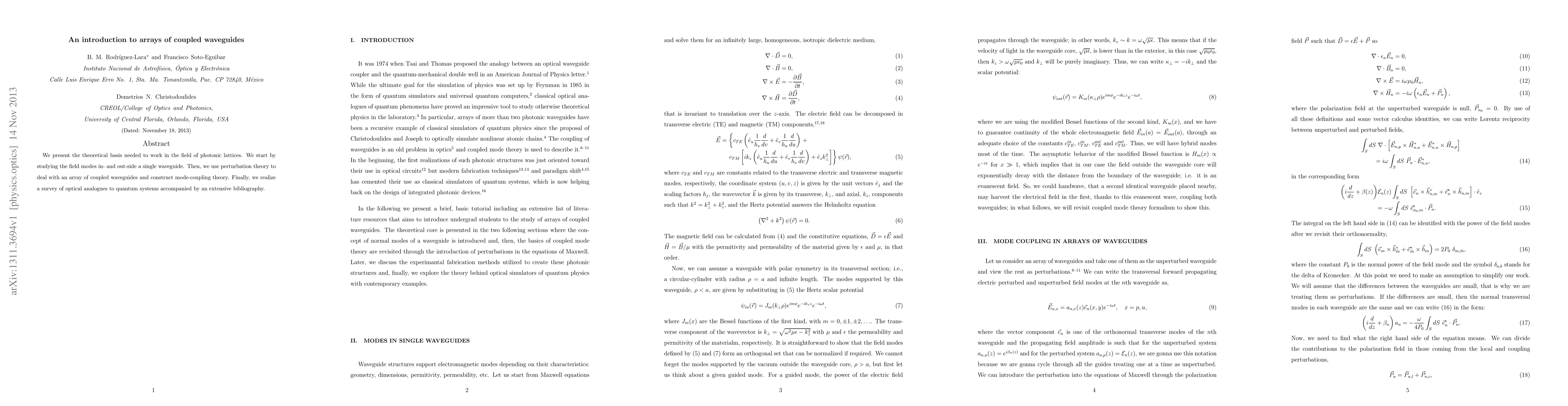 We present the theoretical basis needed to work in the field of photonic lattices. We start by studying the field modes in- and out-side a single waveguide. Then, we use perturbation theory to deal with an array of coupled waveguides and construct mode-coupling theory. Finally, we realize a survey of optical analogues to quantum systems accompanied by an extensive bibliography.