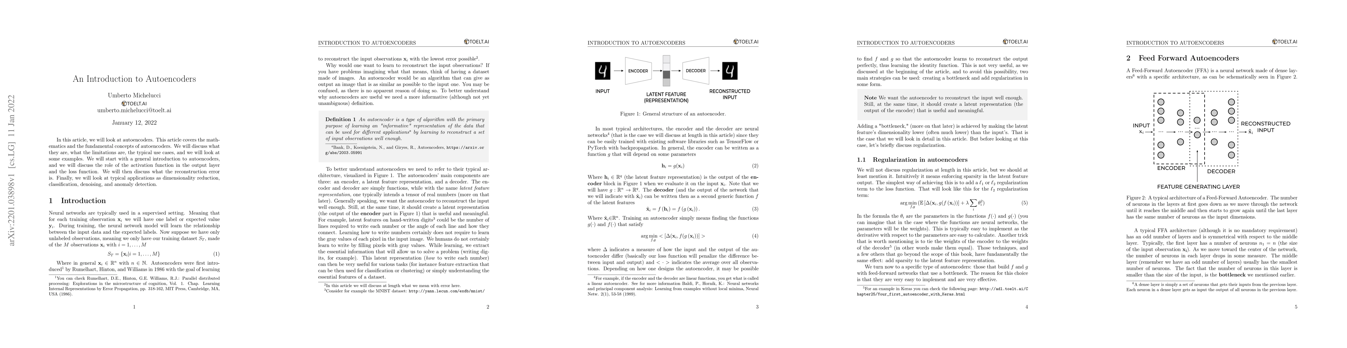 This paper introduces autoencoders, covering their mathematical foundation, limitations, and typical use cases, including dimensionality reduction, classification, denoising, and anomaly detection. It also discusses the role of activation functions and loss functions in the output layer and the concept of reconstruction error.