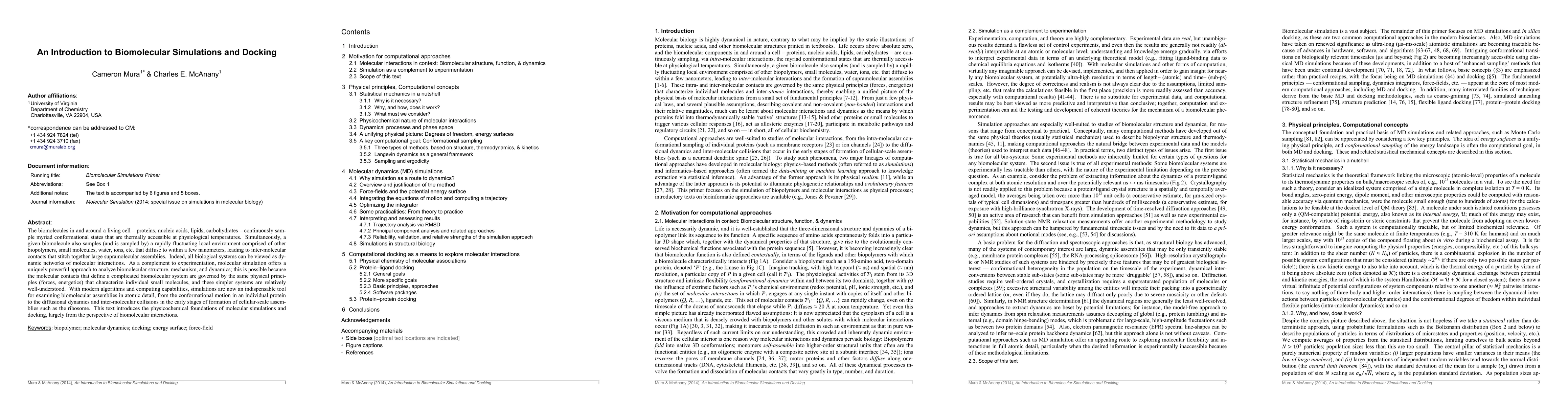 This paper introduces the principles and applications of biomolecular simulations and docking, emphasizing their role in understanding the dynamic interactions and conformational states of biomolecules like proteins and nucleic acids. It highlights how molecular simulations complement experimental methods by providing detailed insights into biomolecular structure, mechanism, and dynamics.