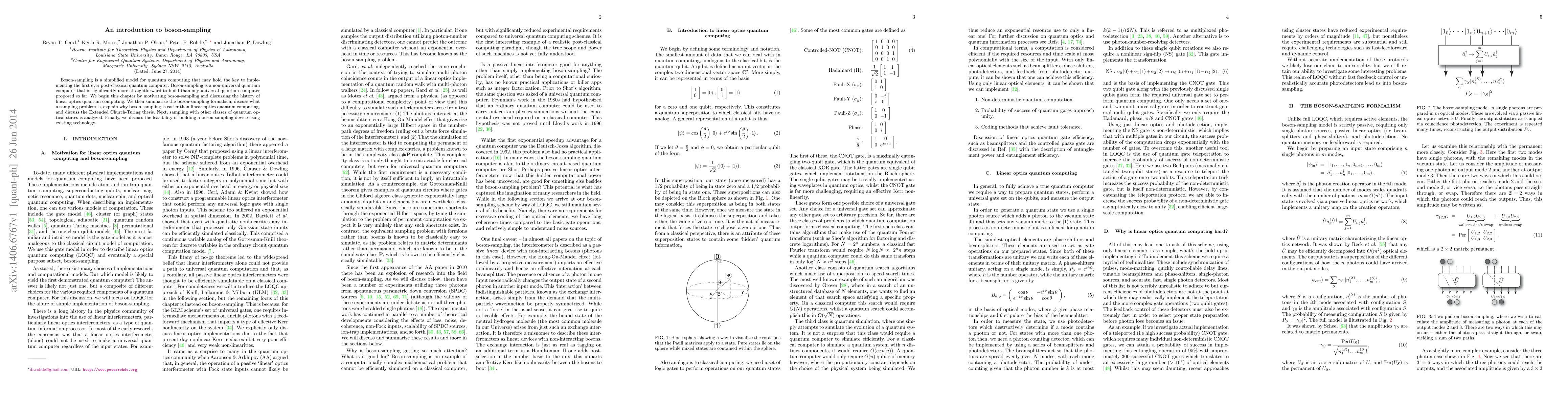 This paper introduces boson-sampling, a simplified quantum computing model that is easier to implement than universal quantum computers. It discusses the history, formalism, and feasibility of building a boson-sampling device using current technology, contrasting it with linear optics quantum computing.