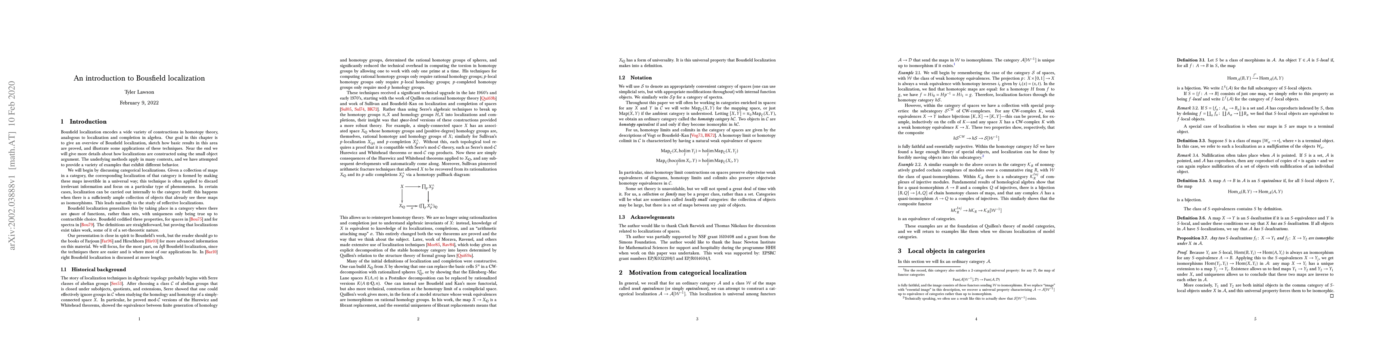 This expository article introduces Bousfield localization, explaining its definitions via mapping spaces and constructions using the small object argument, while highlighting examples and discussing localization in multiplicative contexts. Aimed at a broad audience, it serves as a precursor for a comprehensive book.