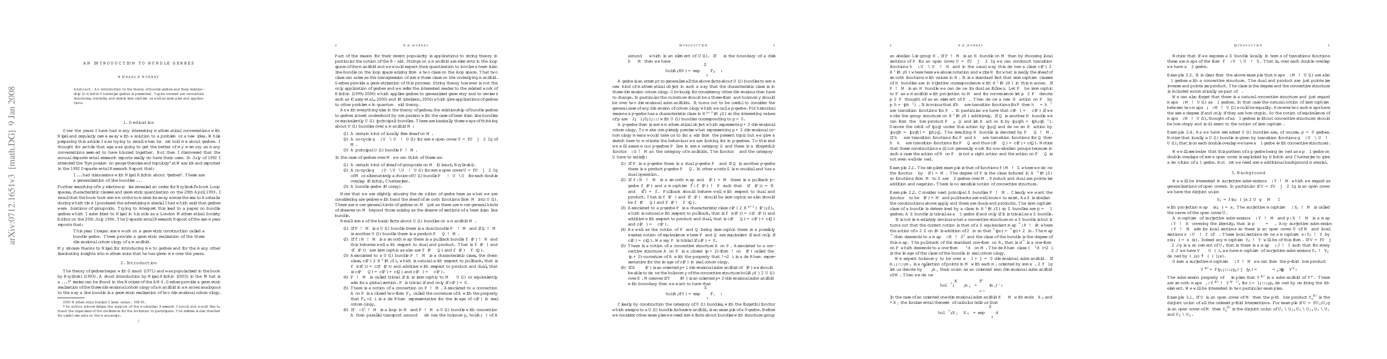 This paper introduces bundle gerbes, explaining their connective structures, and comparing them to Hitchin-Chatterjee gerbes, while discussing their triviality, stable isomorphism, and providing illustrative examples and applications.