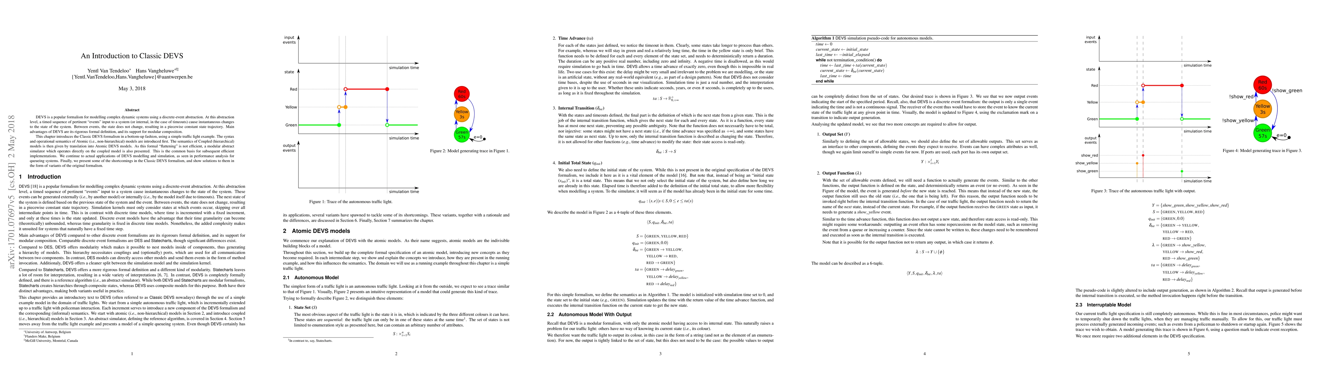 DEVS is a popular formalism for modelling complex dynamic systems using a discrete-event abstraction. At this abstraction level, a timed sequence ofpertinent "events" input to a system (or internal, in the case of timeouts) cause instantaneous changes to the state of the system. Between events, the state does not change, resulting in a a piecewise constant state trajectory. Main advantages of DEVS are its rigorous formal definition, and its support for modular composition. This chapter introduces the Classic DEVS formalism in a bottom-up fashion, using a simple traffic light example. The syntax and operational semantics of Atomic (i.e., non-hierarchical) models are intruced first. The semantics of Coupled (hierarchical) models is then given by translation into Atomic DEVS models. As this formal "flattening" is not efficient, a modular abstract simulator which operates directly on the coupled model is also presented. This is the common basis for subsequent efficient implementations. We continue to actual applications of DEVS modelling and simulation, as seen in performance analysis for queueing systems. Finally, we present some of the shortcomings in the Classic DEVS formalism, and show solutions to them in the form of variants of the original formalism.
