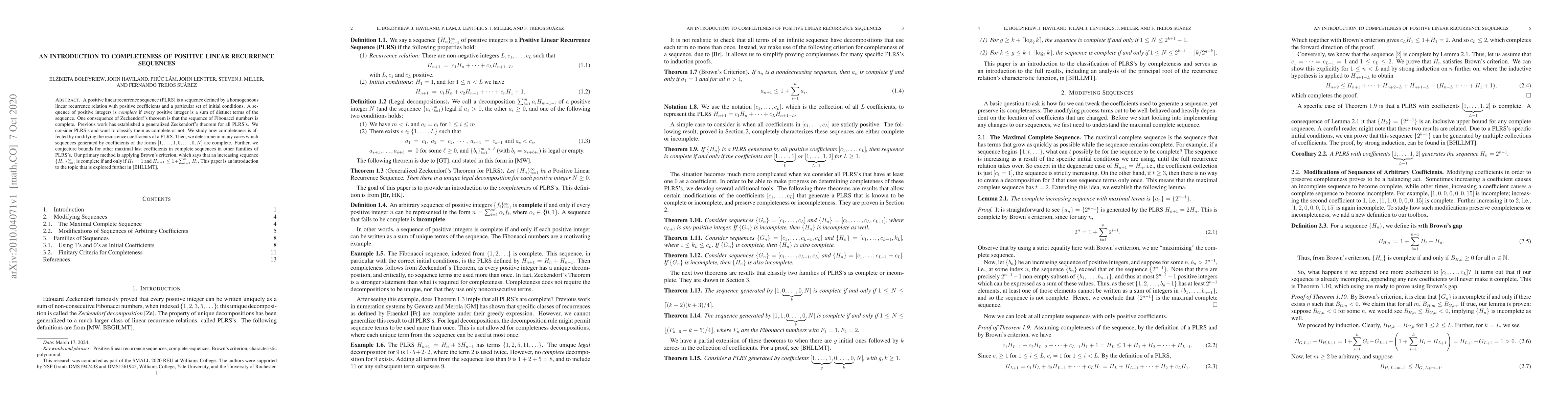 A positive linear recurrence sequence (PLRS) is a sequence defined by a homogeneous linear recurrence relation with positive coefficients and a particular set of initial conditions. A sequence of positive integers is \emph{complete} if every positive integer is a sum of distinct terms of the sequence. One consequence of Zeckendorf's theorem is that the sequence of Fibonacci numbers is complete. Previous work has established a generalized Zeckendorf's theorem for all PLRS's. We consider PLRS's and want to classify them as complete or not. We study how completeness is affected by modifying the recurrence coefficients of a PLRS. Then, we determine in many cases which sequences generated by coefficients of the forms $[1, \ldots, 1, 0, \ldots, 0, N]$ are complete. Further, we conjecture bounds for other maximal last coefficients in complete sequences in other families of PLRS's. Our primary method is applying Brown's criterion, which says that an increasing sequence $\{H_n\}_{n = 1}^{\infty}$ is complete if and only if $H_1 = 1$ and $H_{n + 1} \leq 1 + \sum_{i = 1}^n H_i$. This paper is an introduction to the topic that is explored further in Completeness of Positive Linear Recurrence Sequences arXiv:2010.01655.