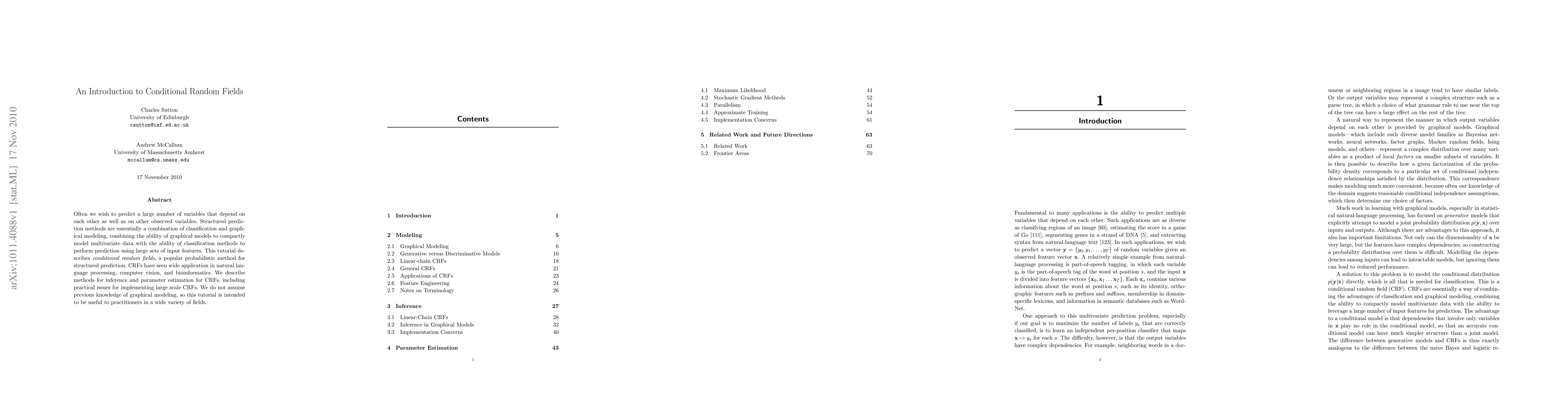 Often we wish to predict a large number of variables that depend on each other as well as on other observed variables. Structured prediction methods are essentially a combination of classification and graphical modeling, combining the ability of graphical models to compactly model multivariate data with the ability of classification methods to perform prediction using large sets of input features. This tutorial describes conditional random fields, a popular probabilistic method for structured prediction. CRFs have seen wide application in natural language processing, computer vision, and bioinformatics. We describe methods for inference and parameter estimation for CRFs, including practical issues for implementing large scale CRFs. We do not assume previous knowledge of graphical modeling, so this tutorial is intended to be useful to practitioners in a wide variety of fields.