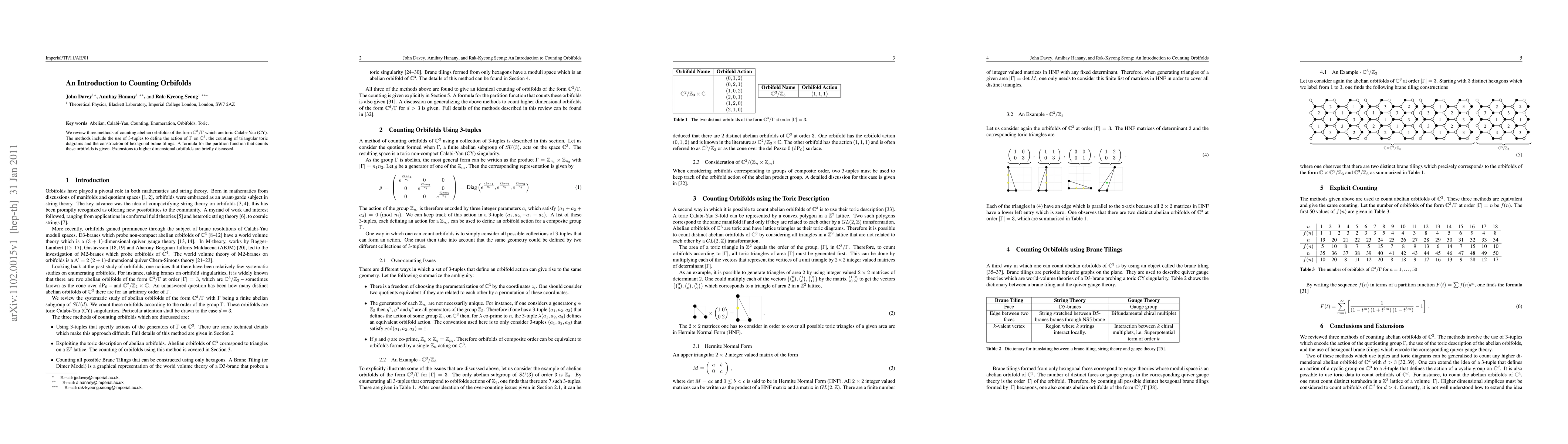 This paper reviews three methods to count abelian orbifolds of the form C^3/Gamma, focusing on toric Calabi-Yau structures. It employs 3-tuples, triangular toric diagrams, and hexagonal brane tilings, and provides a partition function formula for these counts, with a brief mention of higher-dimensional extensions.