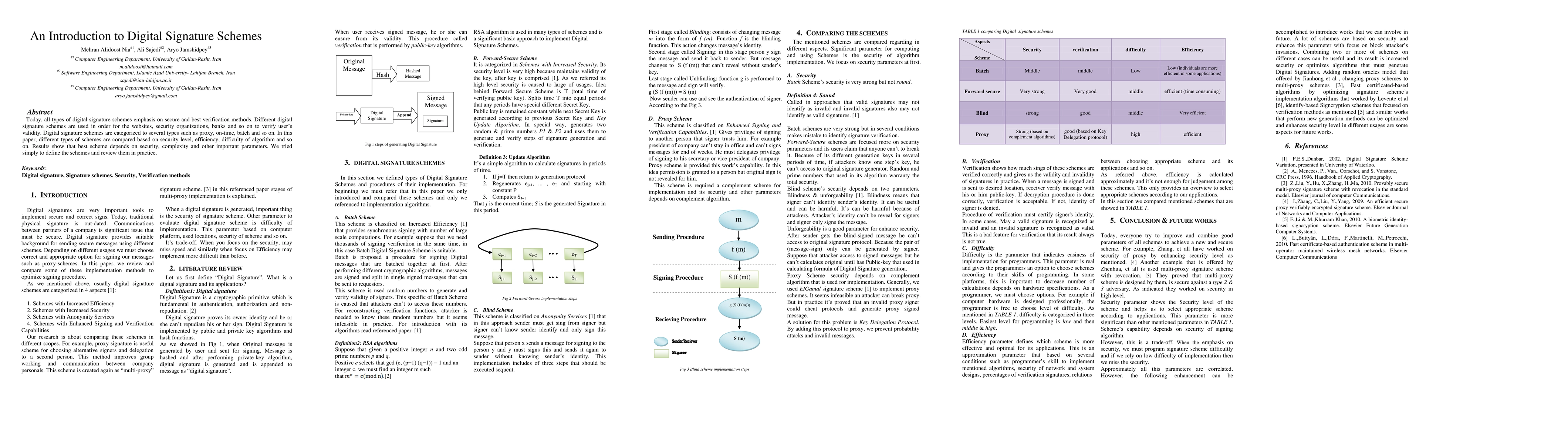 This paper introduces various digital signature schemes, categorizing them into types like proxy and on-time, and compares them based on security, efficiency, and algorithm complexity. The conclusion is that the best scheme depends on specific security and complexity requirements.